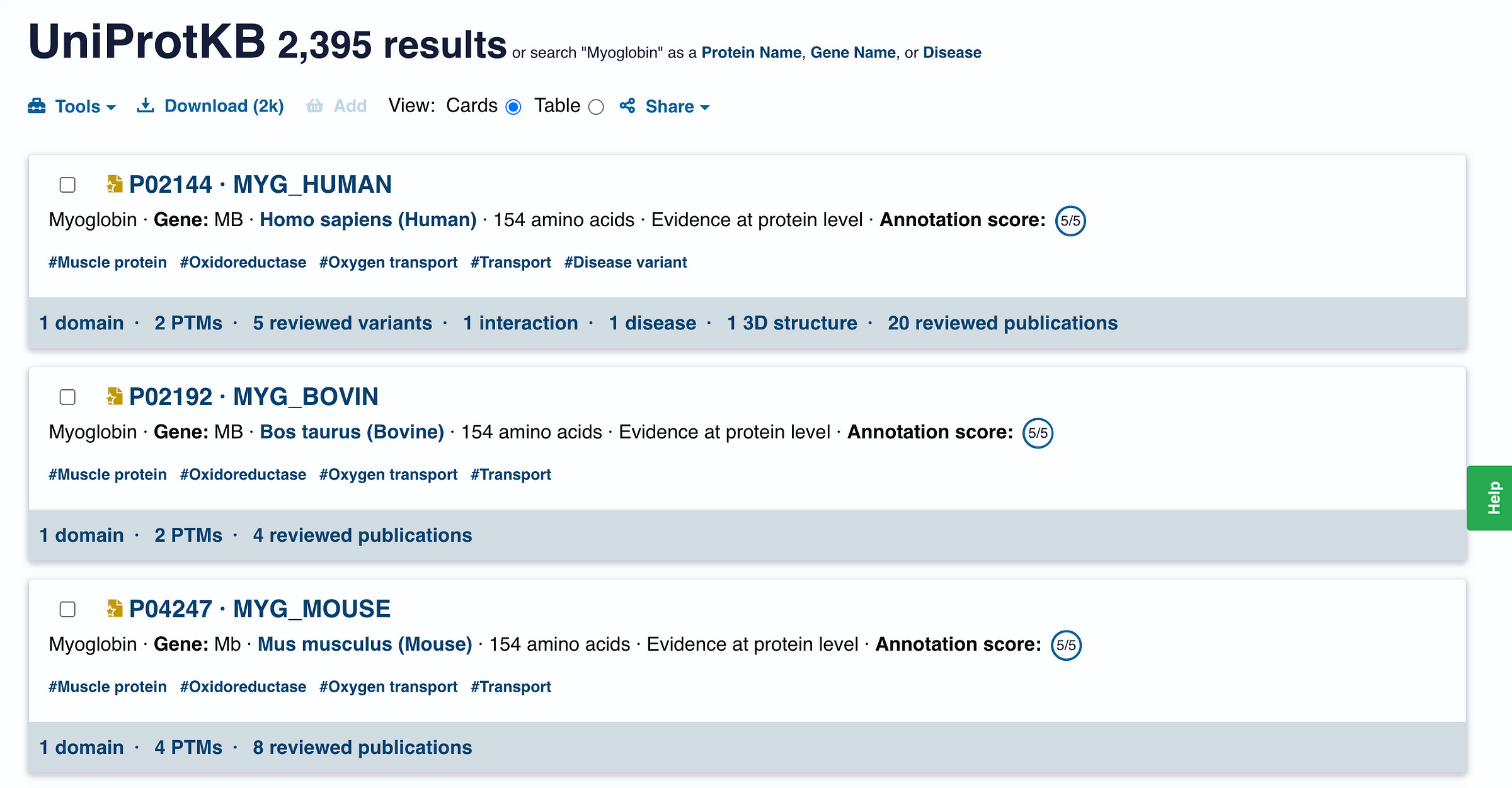 This search returns 2395 results for Myoglobin found in all different organisms.