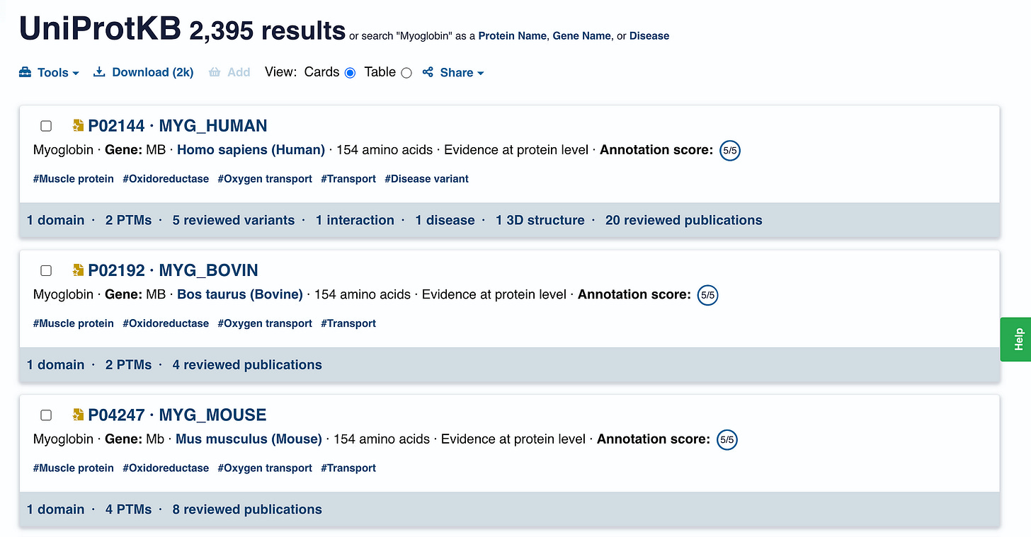 A quick search with the term ‘Human Myoglobin’ returns the following result.