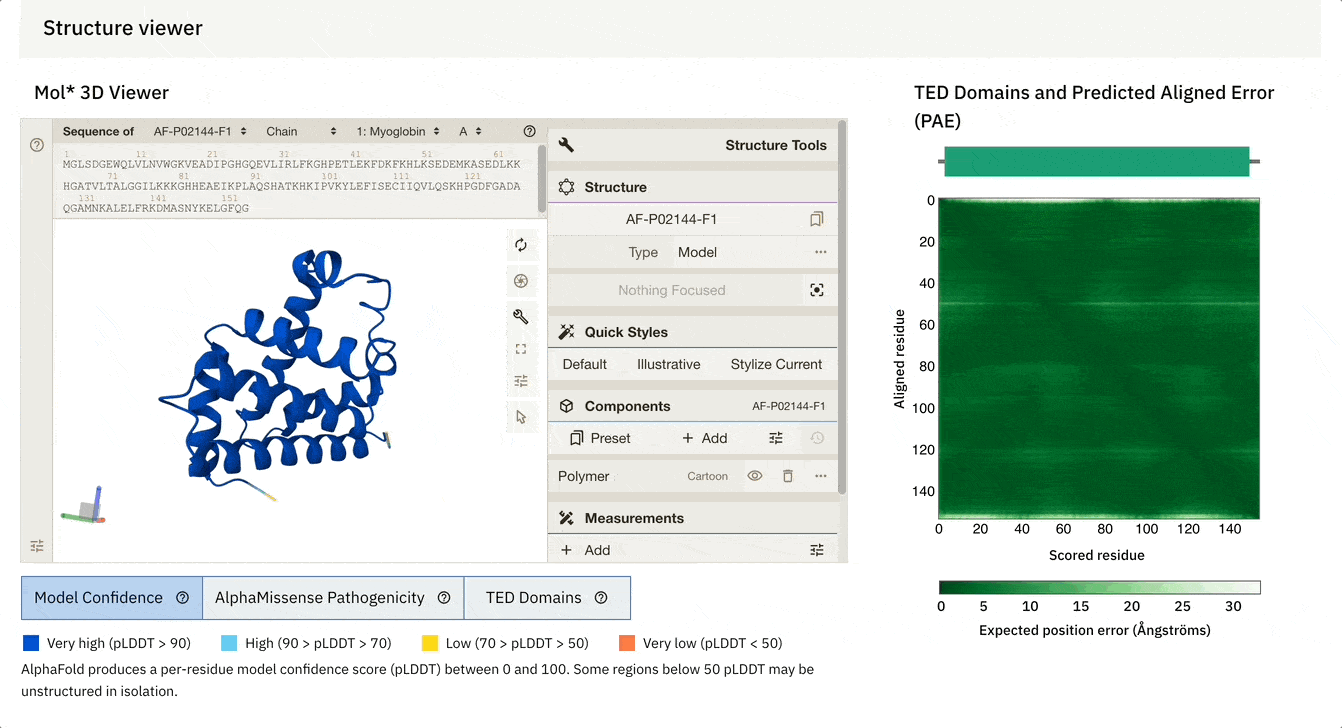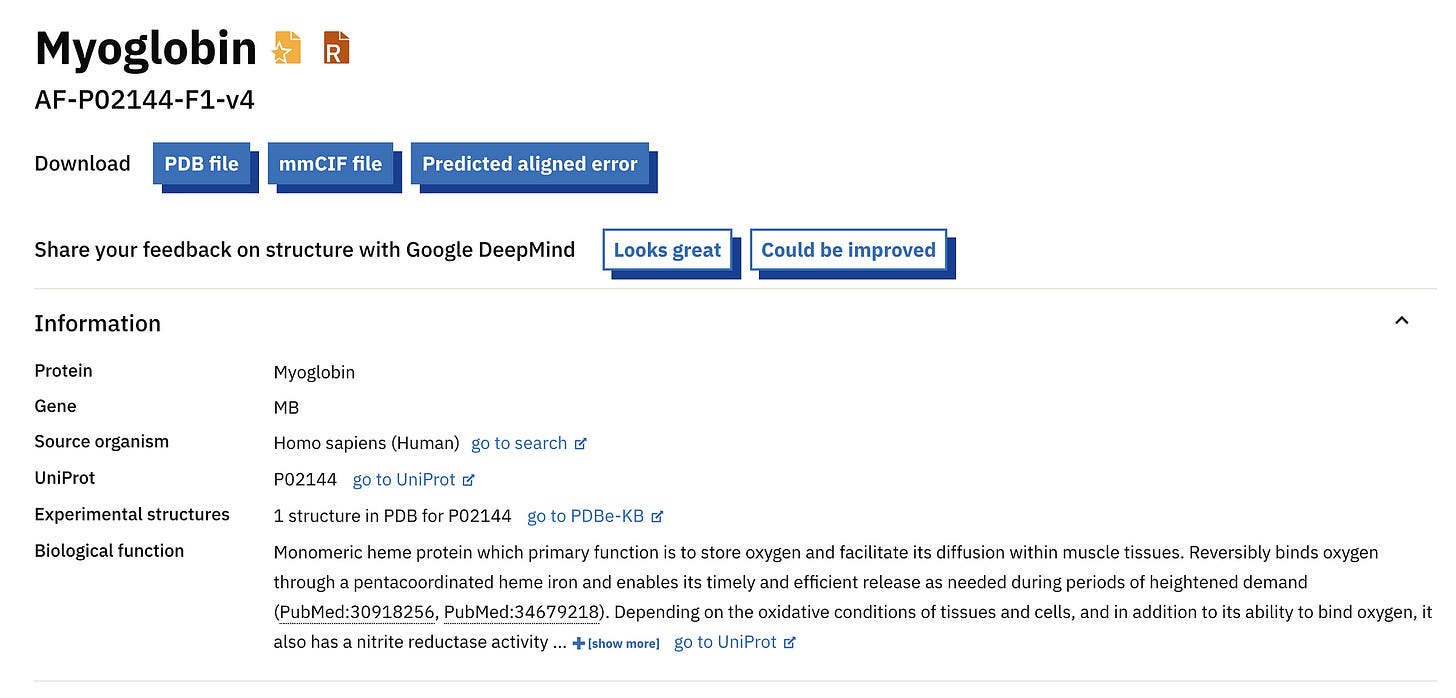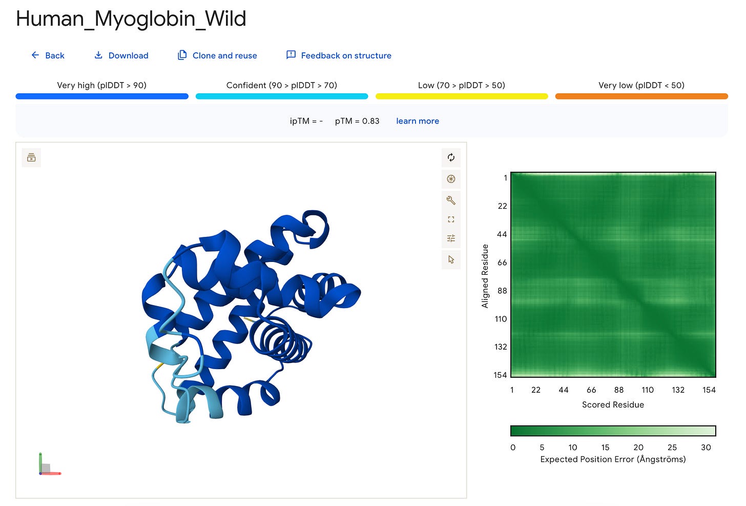 We can download the PDB (Protein Data Bank file), CIF (Crystallographic Information File) and PAE (Predicted Aligned Error) files from this page.