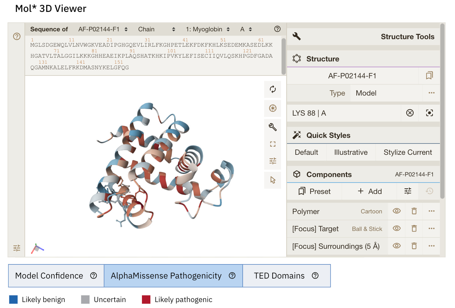 When the 3D visualisation is switched to the ‘AlphaMissense Pathogenicity’ tab, the displayed colour for each amino acid is the average AlphaMissense pathogenicity score across all possible amino acid substitutions at that position.