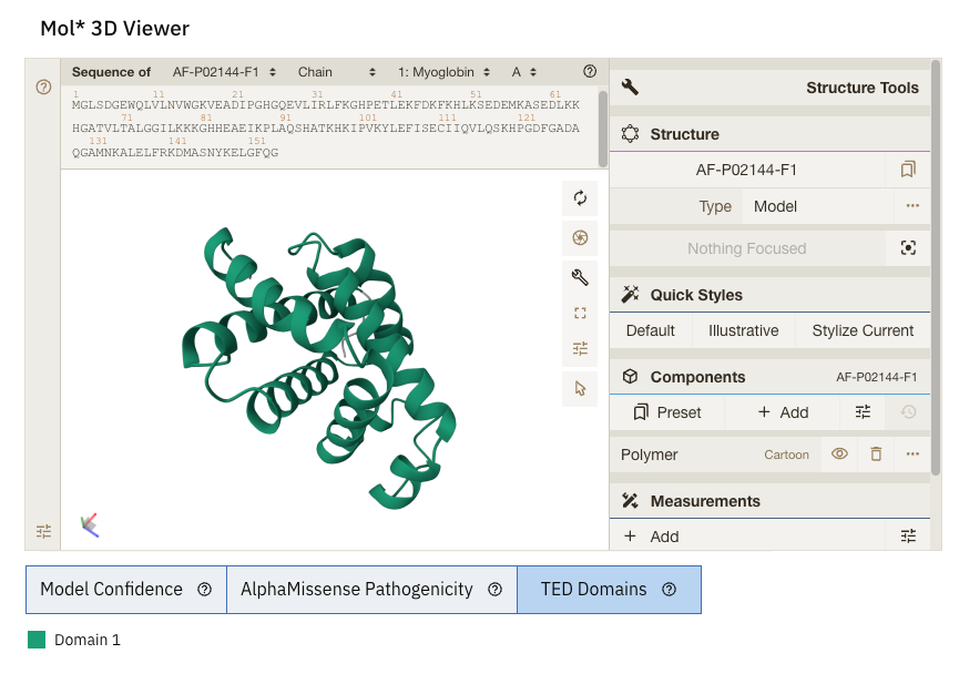 TED Domains: this colours the protein as per the number of domains (just green in our case because our protein has one domain)