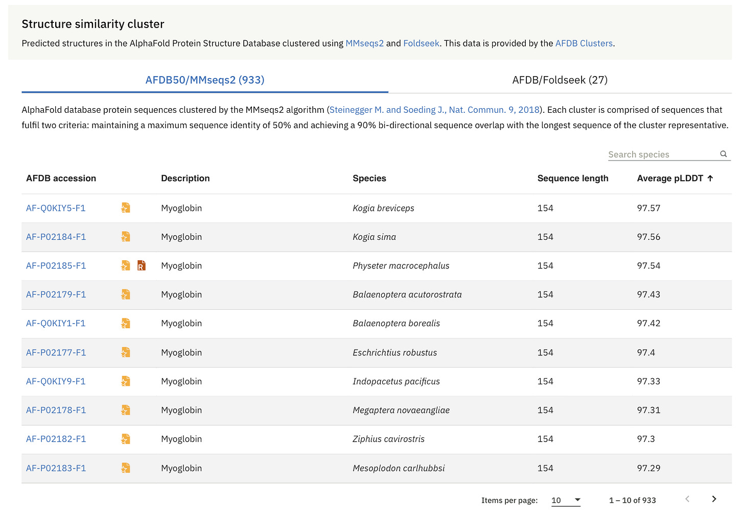 While the above is a quick structure-based search, the AlphaFold database also gives a broader and more thorough similarity context for a protein.