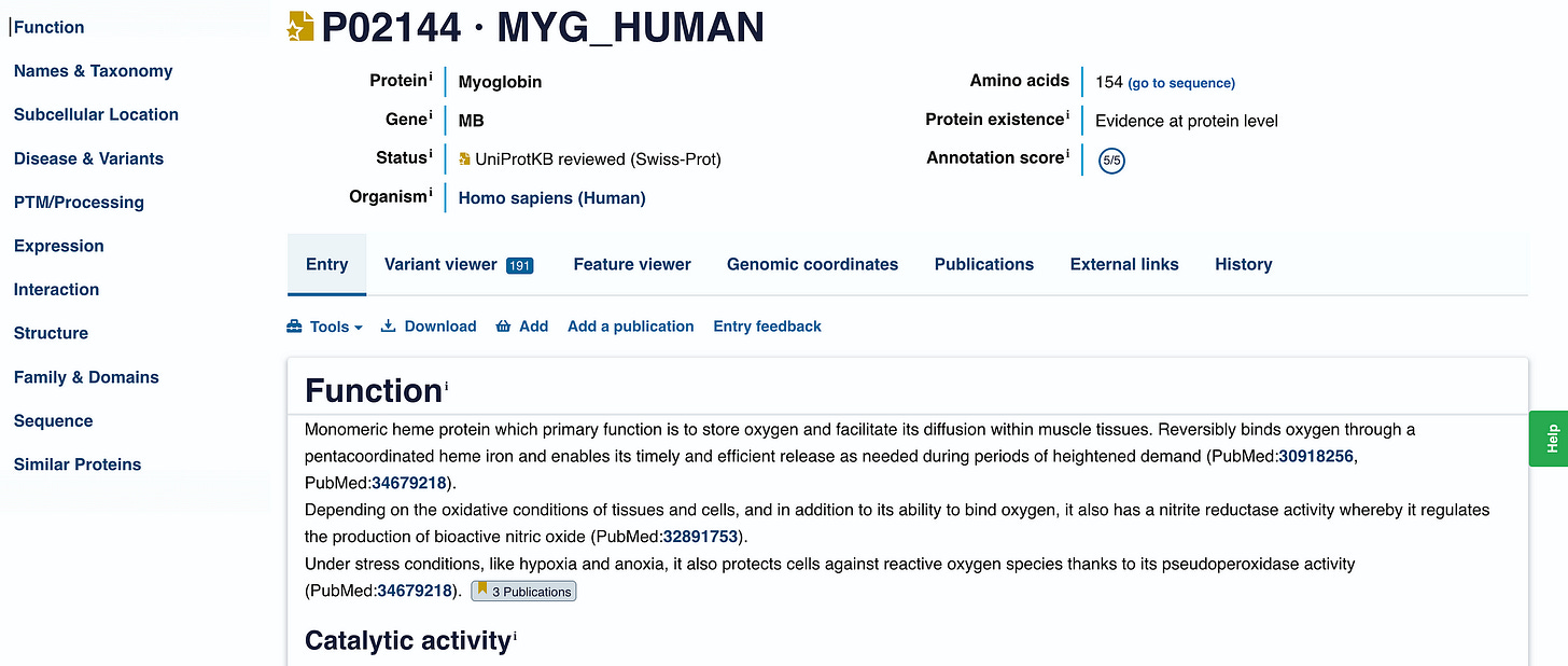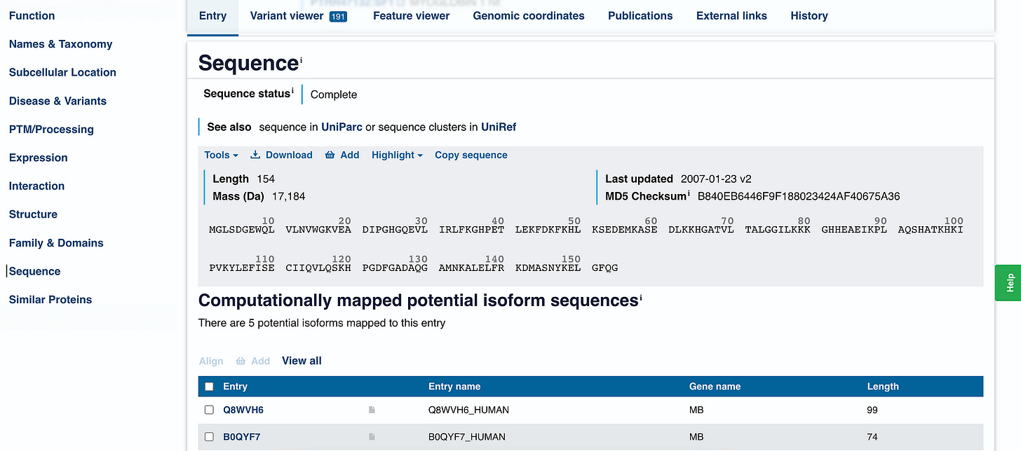 We can tell that human Myoglobin is made up of 154 amino acids (documented as ‘length’) and has a mass of 17,184 daltons, which is quite small compared to big proteins in our body.