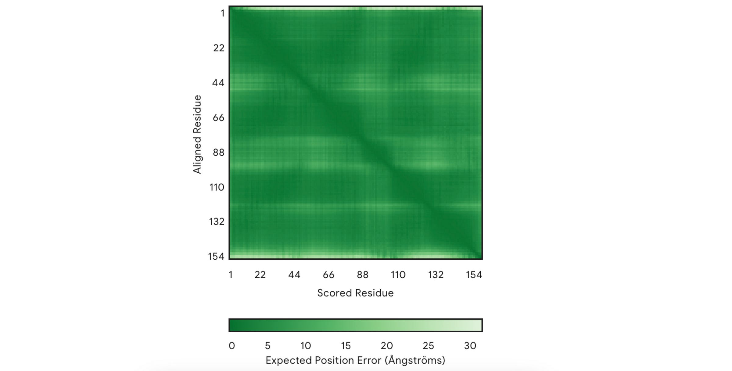 In each square, the shade of green shows the predicted error in the distance (measured in Å) between two residues.