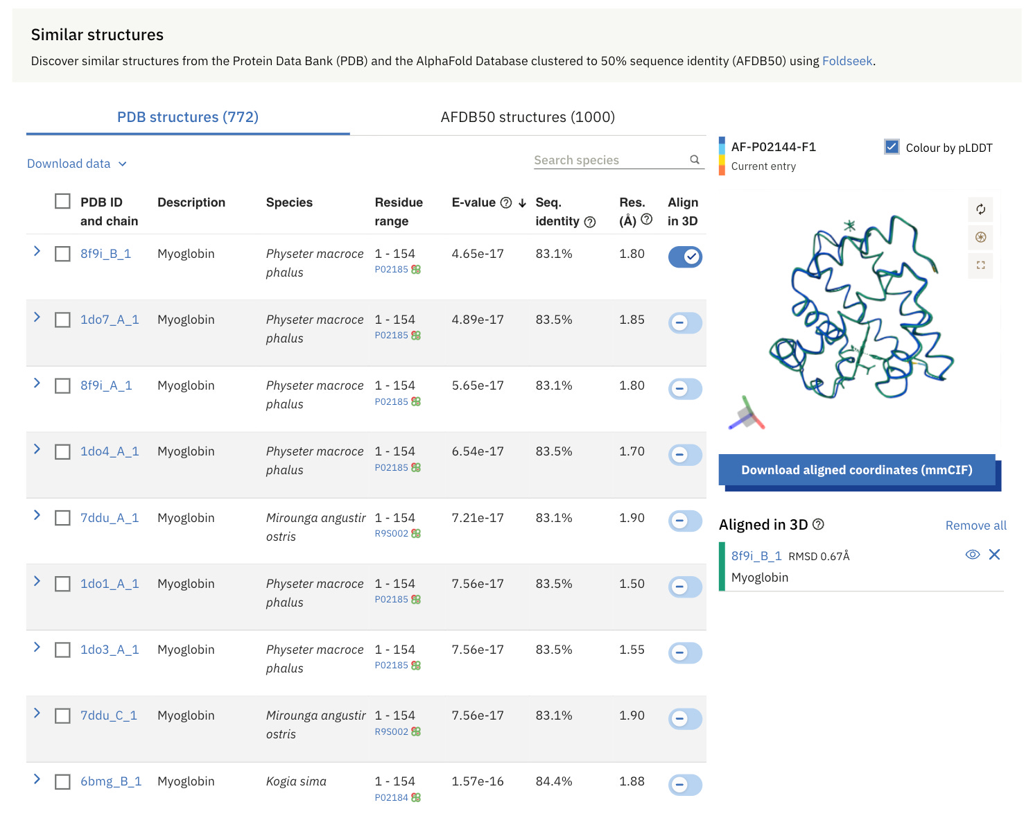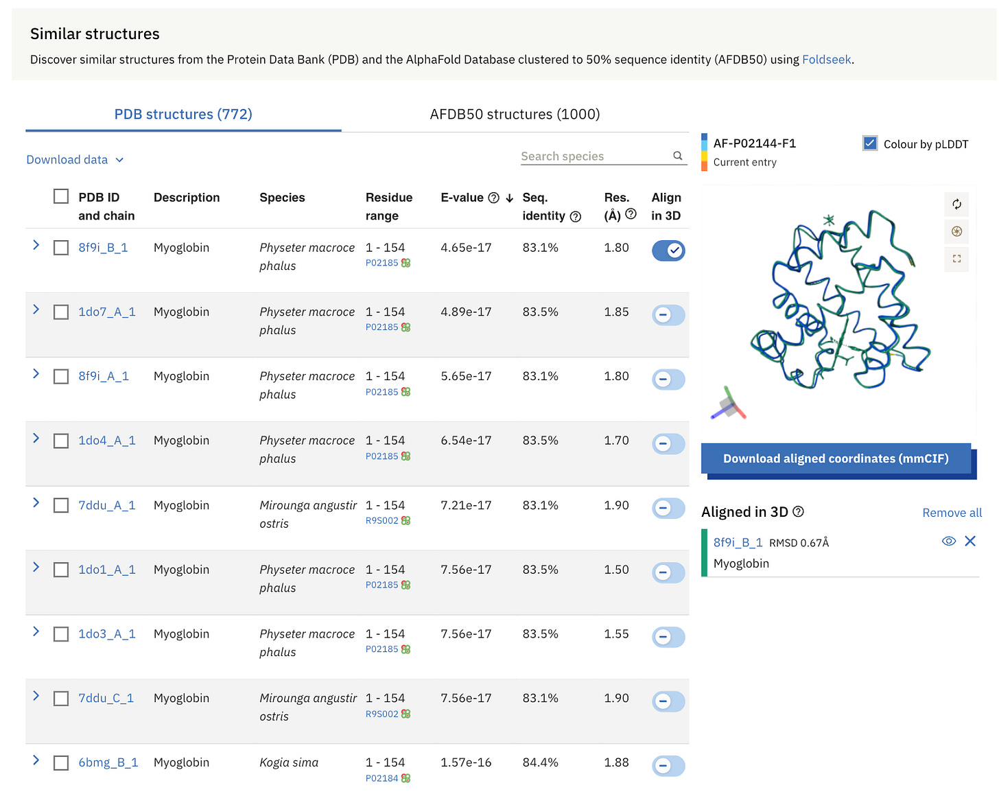 On the results page, we can also find the most structurally similar proteins to human Myoglobin.