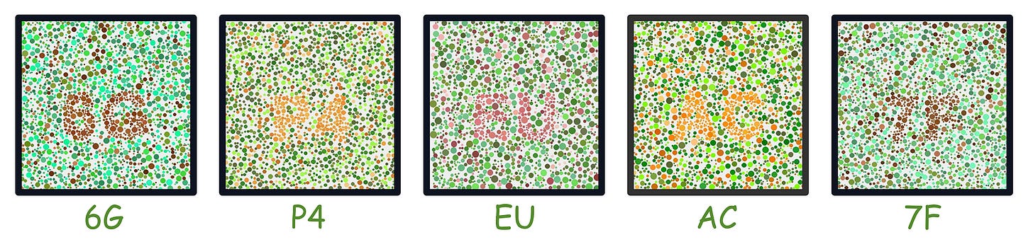 ColorBlind: A collection of 150 images that are inspired by Ishihara tests for color blindness. These images hide characters among similarly colored dots and test a model’s pattern perception in noisy, color-confusing environments.