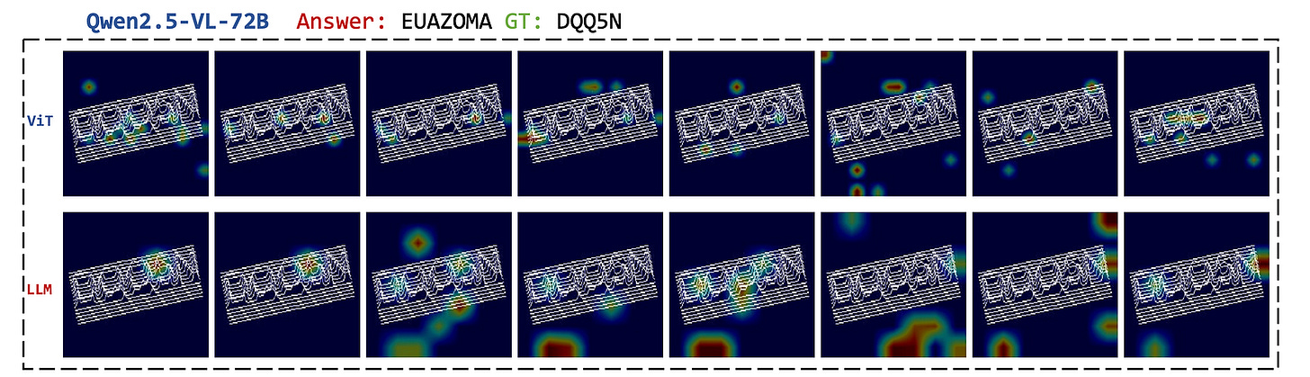 When this method is applied to Qwen2.5-VL, it is seen that the Vision encoder of the model, which is meant to extract meaningful visual features from images, focuses on irrelevant areas or only parts of the correct characters.