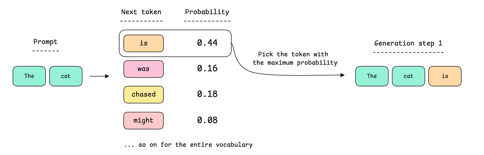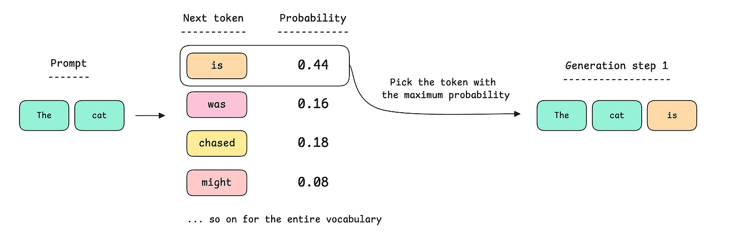 At the first step of generation, the model could produce a probability distribution and select the token with the highest probability, as shown below.