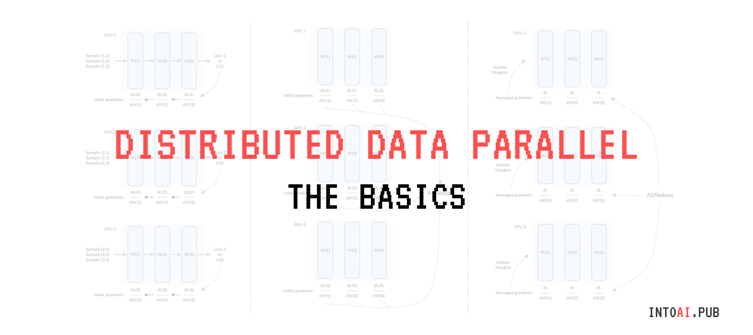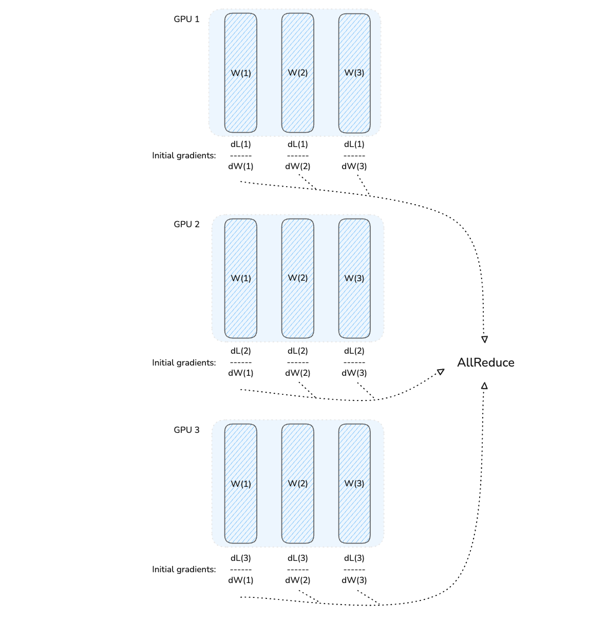 Following this, gradients from all GPUs are aggregated and averaged using the AllReduce operation.