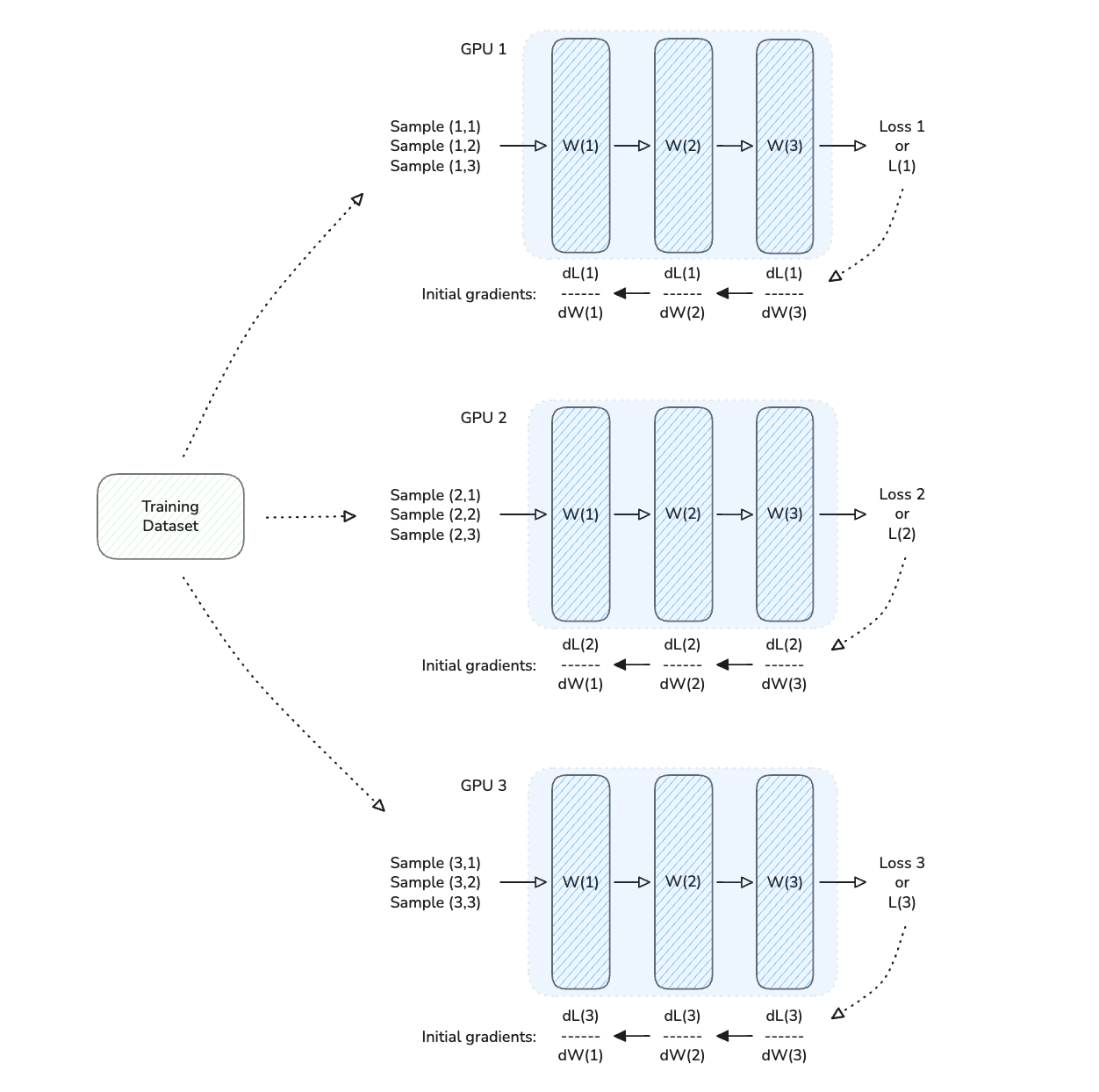 Each GPU runs a forward and backward pass, computing loss and gradients