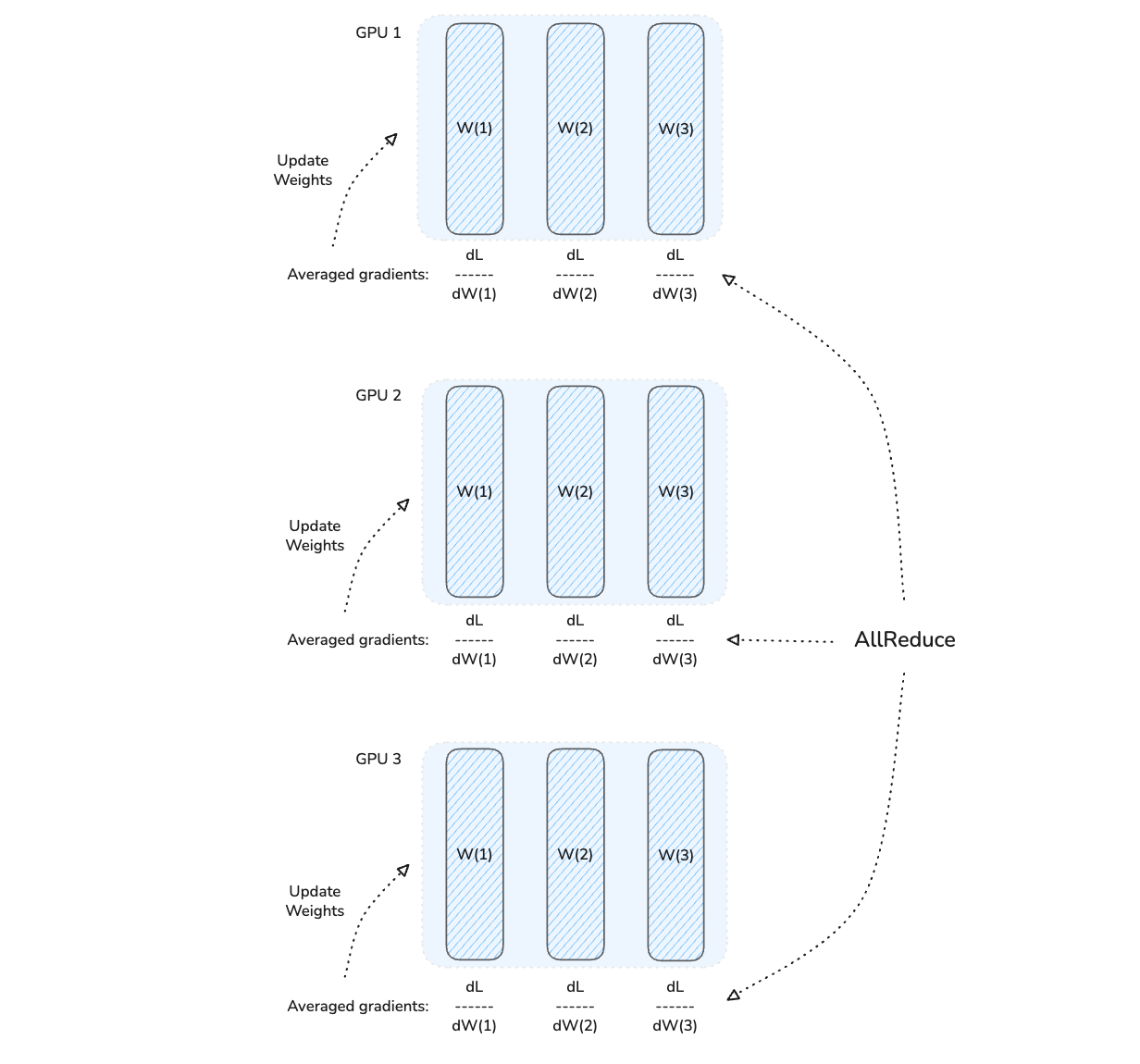 Each GPU updates its copy of model weights using the averaged gradients. As each GPU starts with the same model weights and updates them using the same averaged gradients, all the resulting model copies remain in sync with other GPUs.