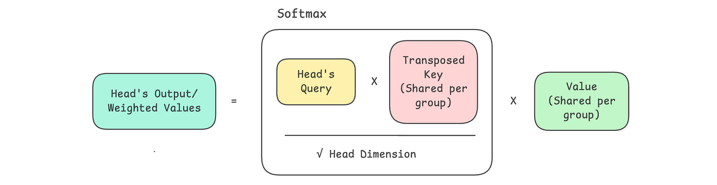 This means that we create only num_groups sets of K and V vectors per token, each shared across multiple query heads.