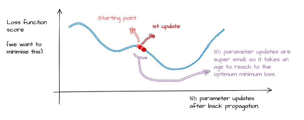 That’s basically zero. This means that the update to Wh during training is so tiny, it’s like the model is frozen. It can’t escape its starting point. It just sits there, unable to learn anything useful.