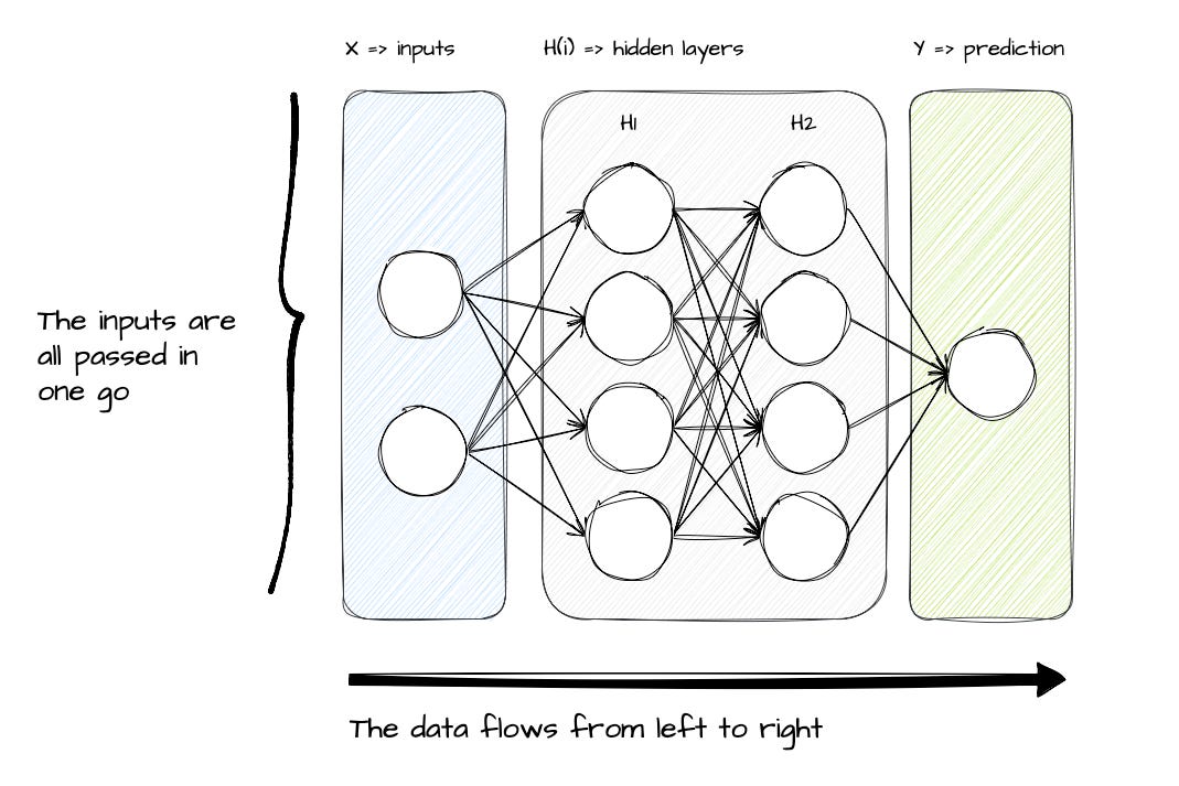 You see theXinput? From a DNN’s perspective, it’s a torrent of data, all pushed and processed at once. There is nowhere in this diagram that the network can say, “Hey, can you just send meX1andX2first, and then I can processX3andX4?”.The DNN is feed-forward (or sequential).