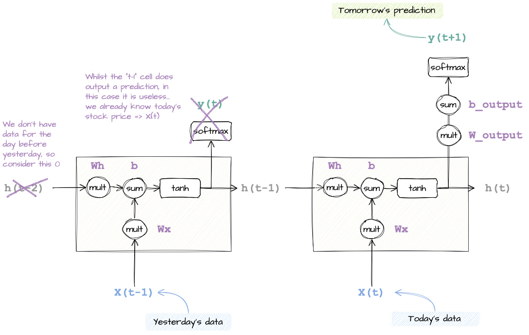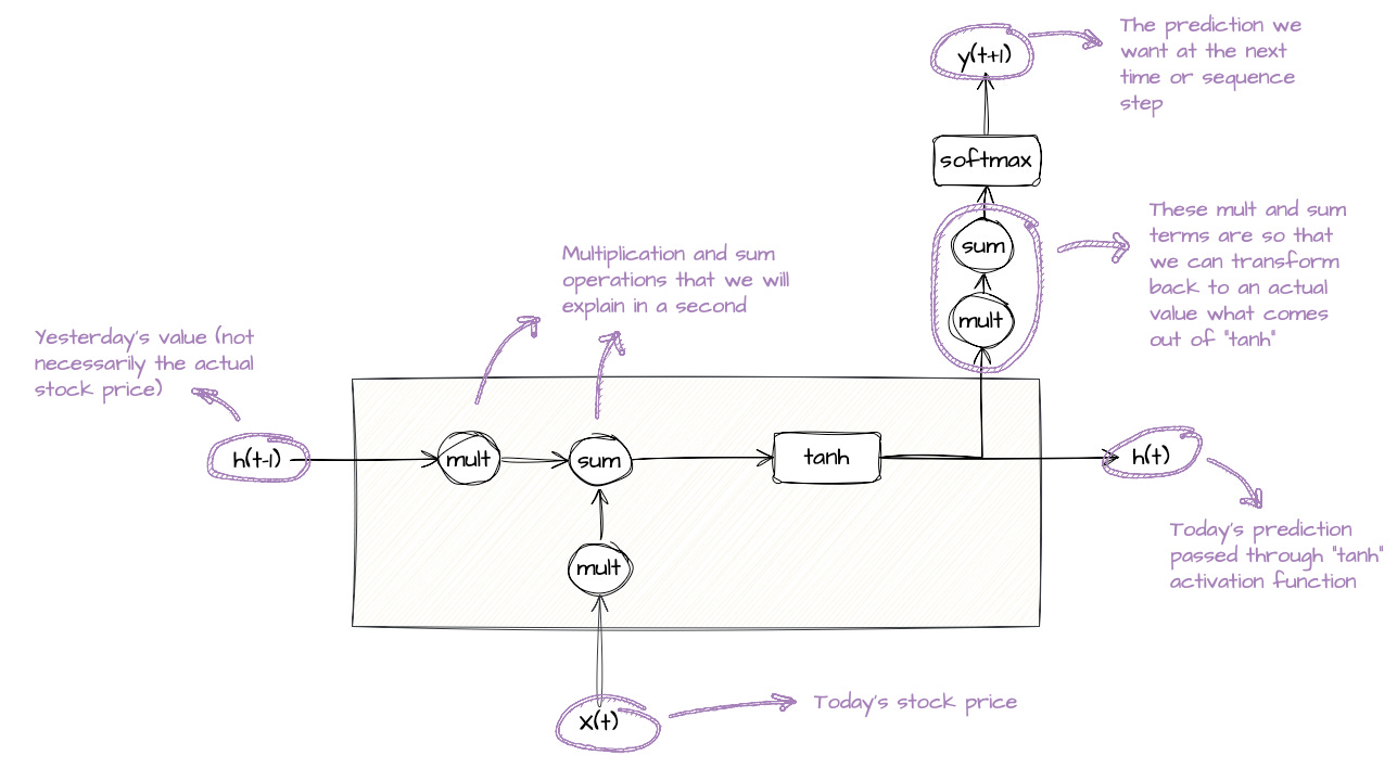 h(t-1)by thinking it is yesterday’s stock price. It is what comes out of the cell (with its multiplications, sums, and activation functions) applied to yesterday’s stock price.b: This is the bias term. Think of it as a small correction applied regardless of the input. It’s important in training, but not very interesting for understanding how RNNs work conceptually (as it affects DNNs the same way). If you want to deep dive, check this link.