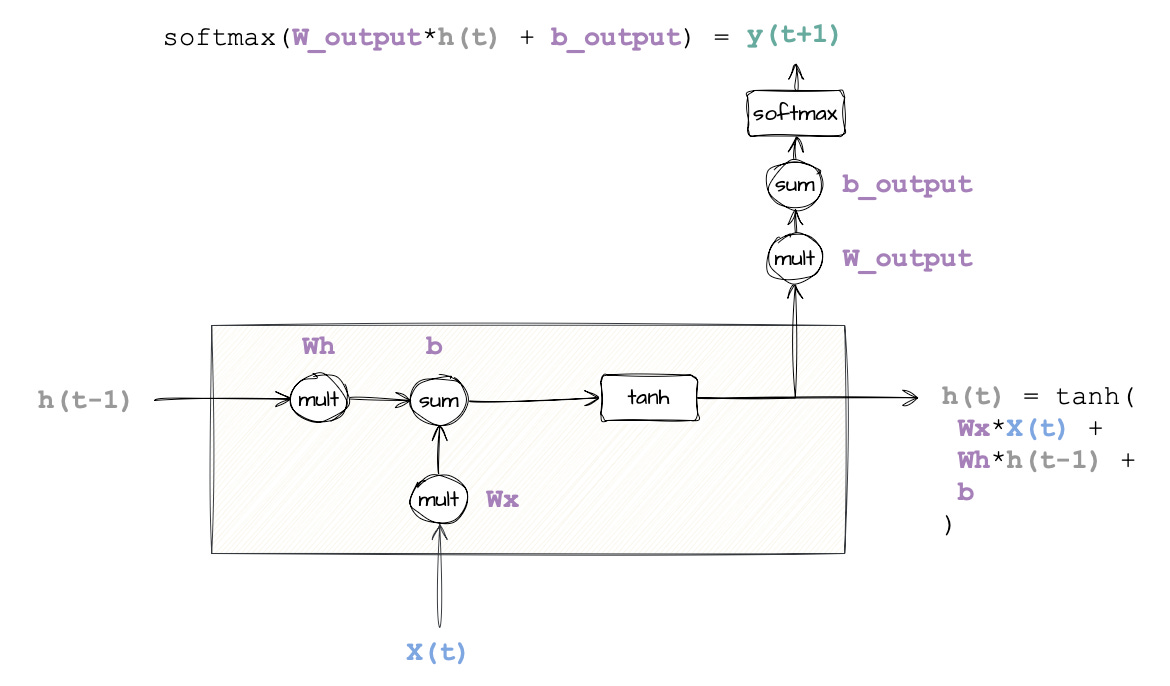 X,handYelements (similar to the classical DNN diagram).X(t)represents today's data point,h(t-1)is what came from yesterday,h(t)is what is passed to predict tomorrow, andY(t+1)is the predicted data point.Y(t+1)represents the prediction that we want.tanhandsoftmaxare just activation functions. The same kind you have seen in regular neural networks, so nothing special for RNNs. They take raw values and squash them into a friendlier range, like between -1 and 1 (fortanh) or 0 and 1 (forsoftmax).Finally, there are a couple of blobs with