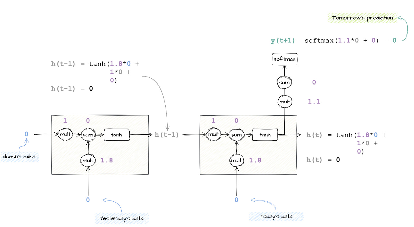 We begin by plugging in yesterday’s stock price. Because there is no data prior to yesterday, we can ignore the previous hidden state input