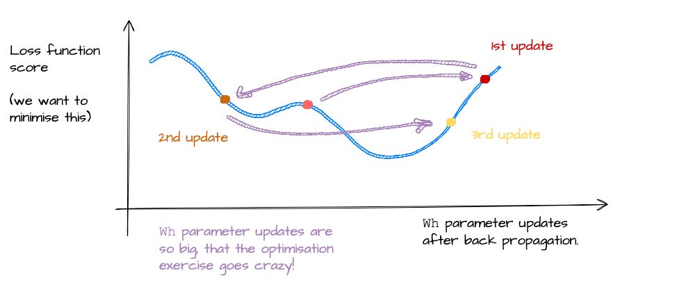 That’s nearly a billion. This means that during backpropagation, the gradient becomes massive. And with a gradient that large, your weight update becomes a wild jump.