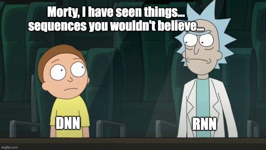 DNNs are “memory-less” because of the two points mentioned above. And being “memory-less” means that DNNs really struggle to predict when sequence or order matters.