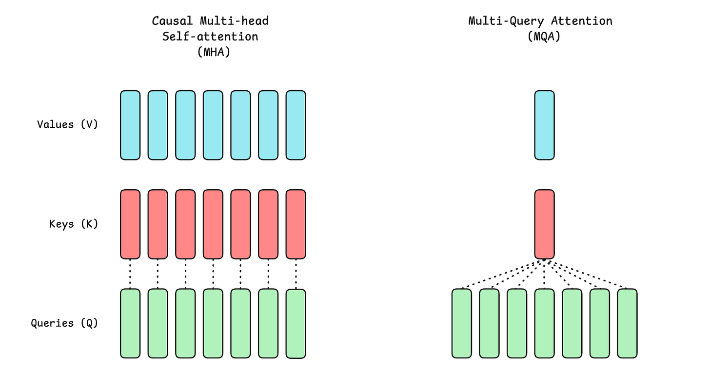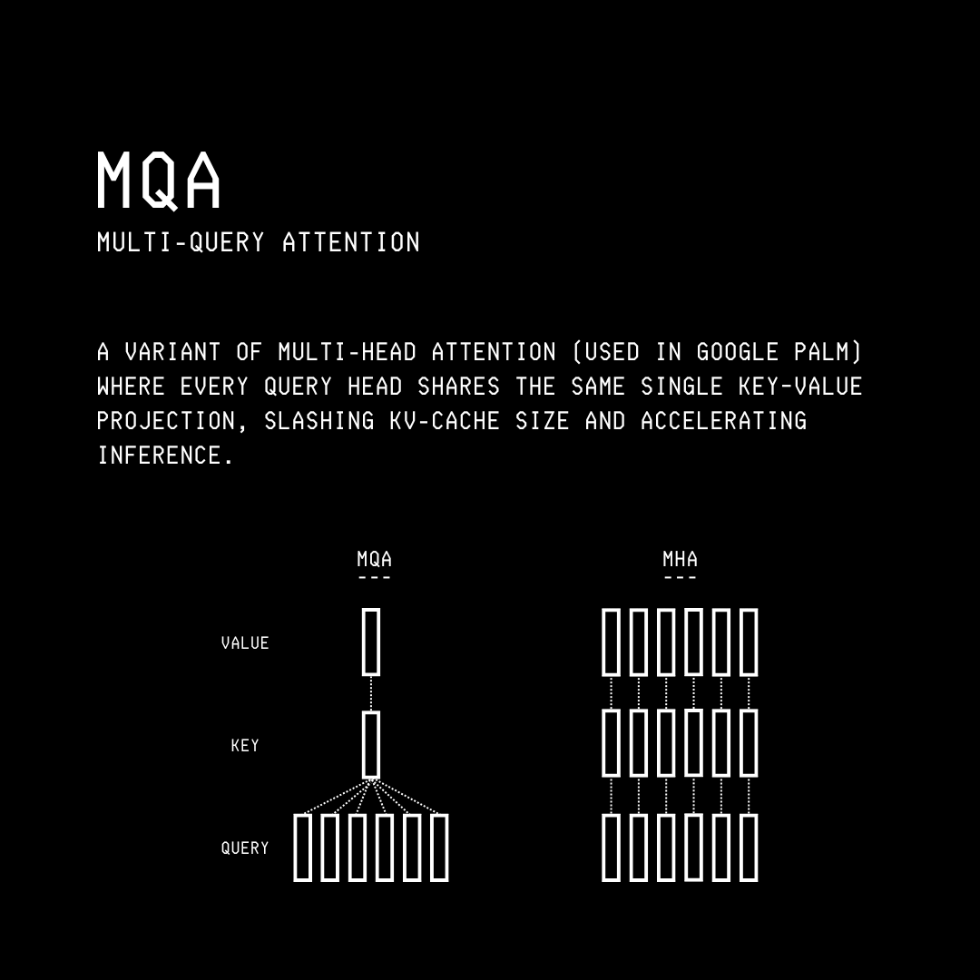 This is where he introduces Multi-Query Attention (MQA), an efficient variant of MHA that significantly reduces memory usage and speeds up inference.