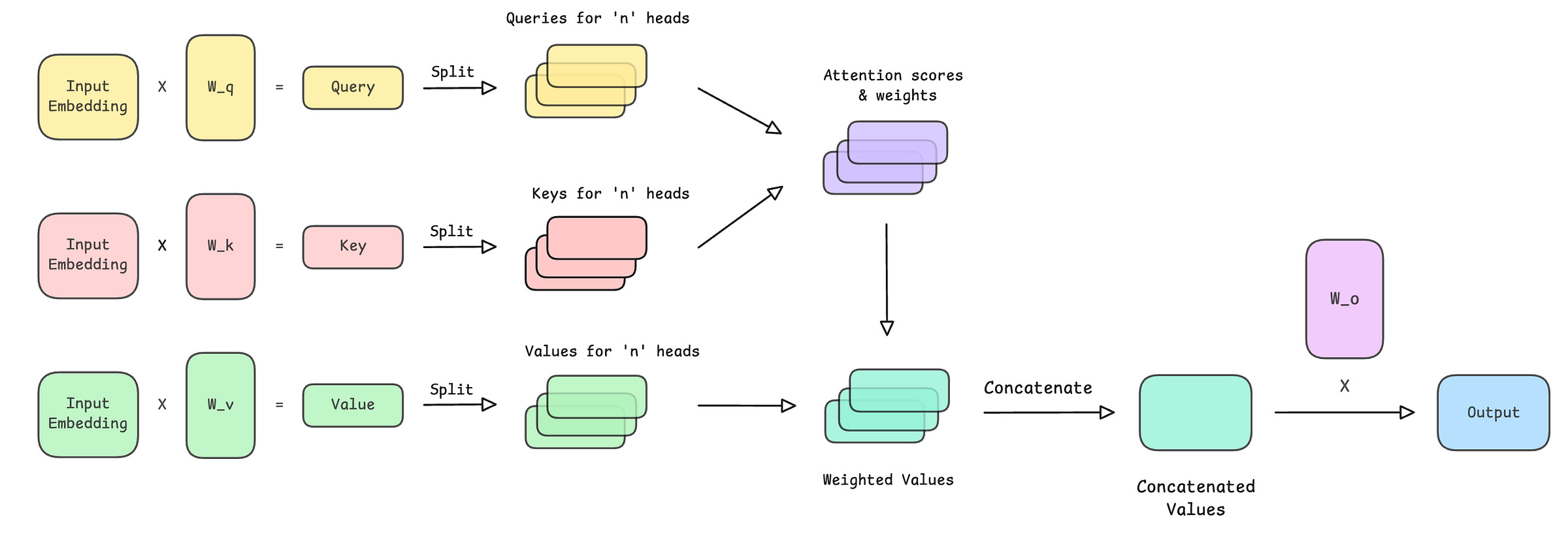 output = mqa(input_embeddings)Note how MQA preserves the shape of the input ([batch_size, sequence_length, embedding_dim]) just like MHA. This lets us stack multiple MQA layers together in a Transformer block.
