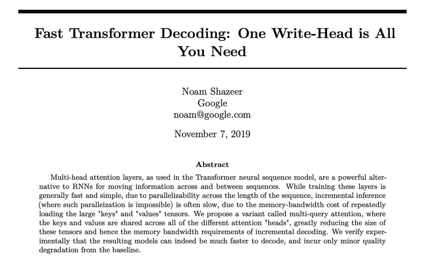 It was therefore made more efficient by Noam Shazeer in his research paper titled ‘Fast Transformer Decoding: One Write-Head is All You Need’.