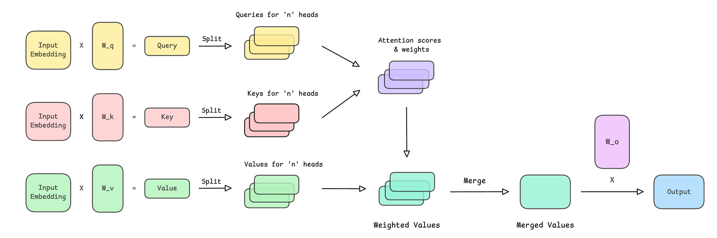 The head outputs are merged and passed through a final output projection matrix