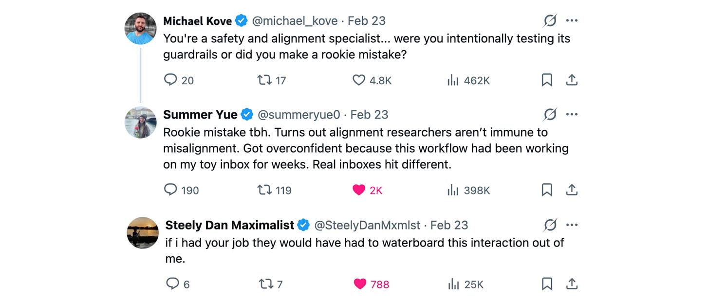 For context, Summer Yue is the director of Safety and Alignment at Meta Superintelligence Labs.