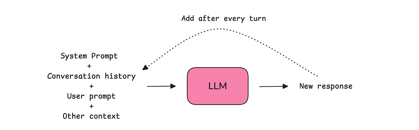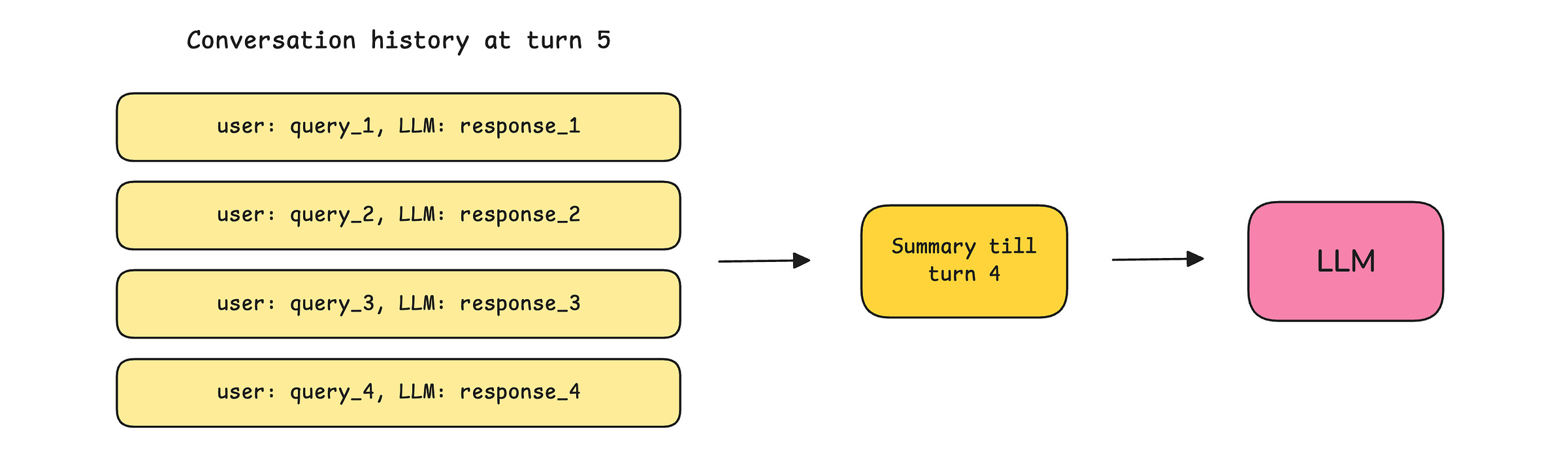 Summarization/ Compaction: Where the previous conversations are summarized and passed to the LLM at each turn, rather than the complete conversation history.