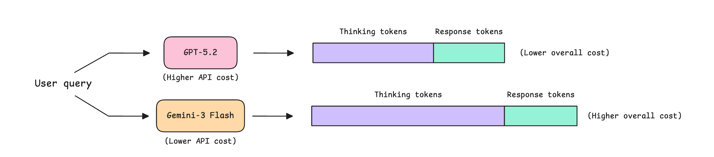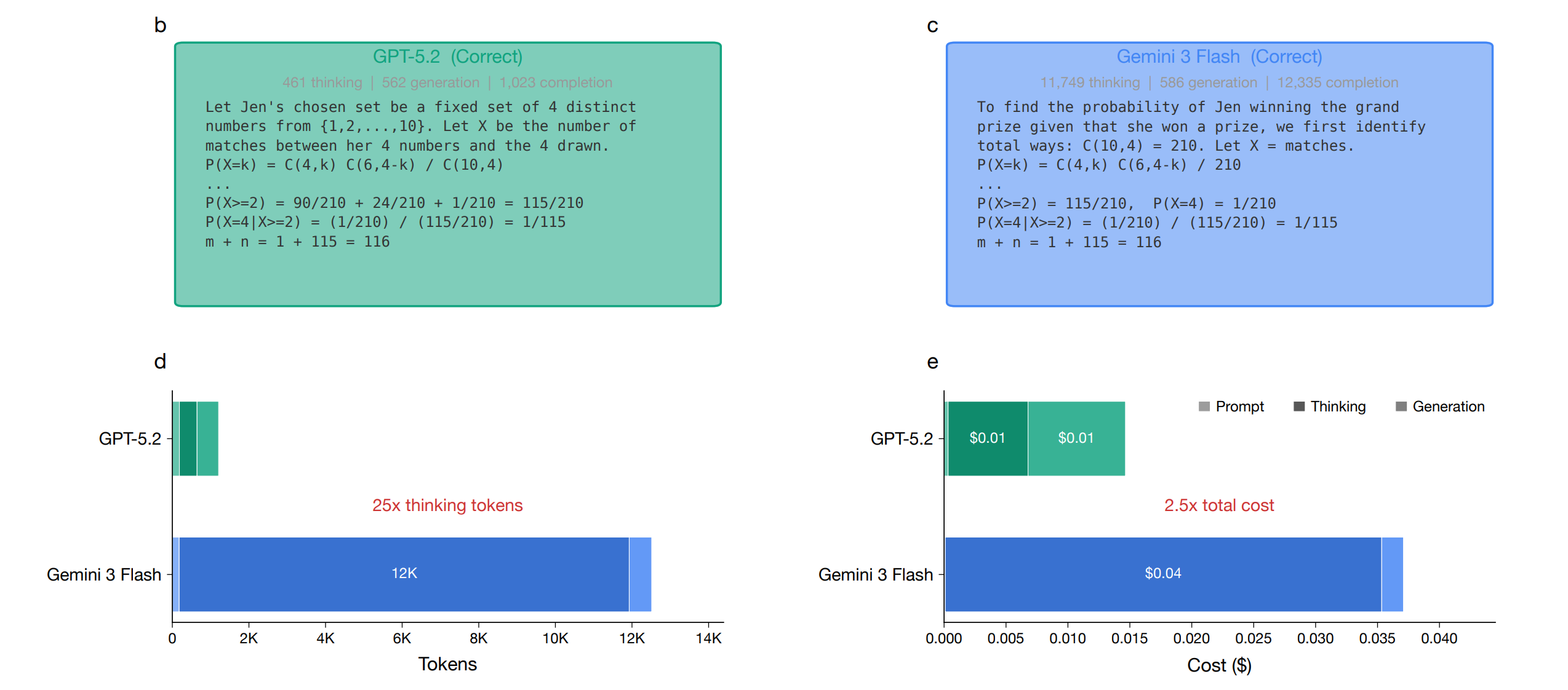 Even though Gemini 3 Flash has a lower per-token price than GPT-5.2, the 25x gap in thinking token generation results in a 2.5× higher actual cost to solve this question!
