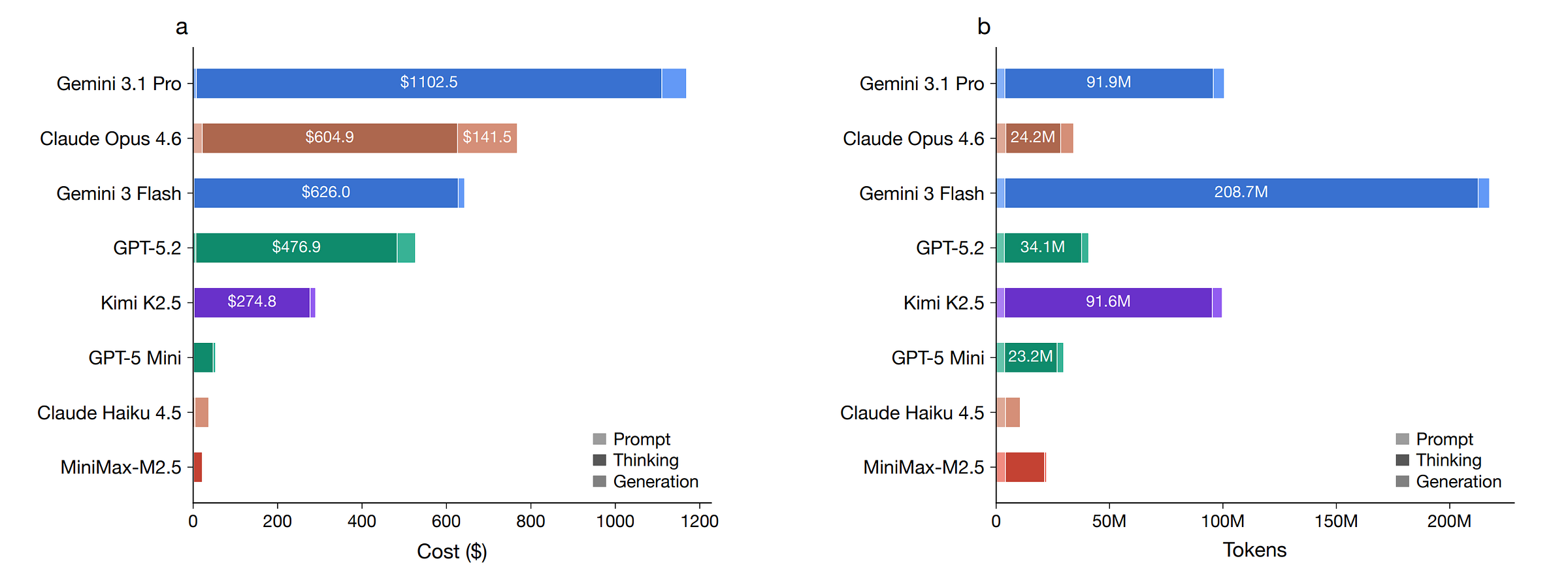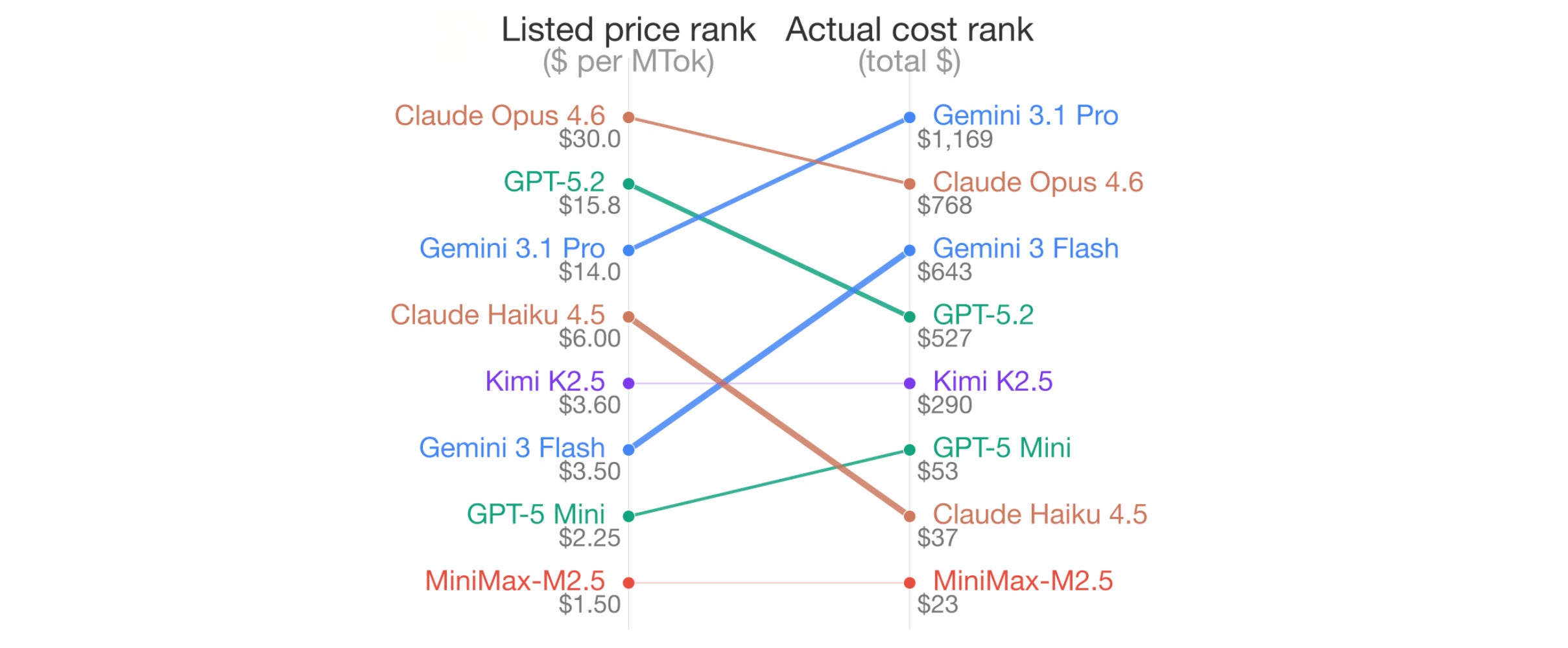 Furthermore, the mismatch between pricing and their actual costs for all models is shown below, with Gemini 3.1 Pro being the most expensive and MiniMax-M2.5 the cheapest overall.