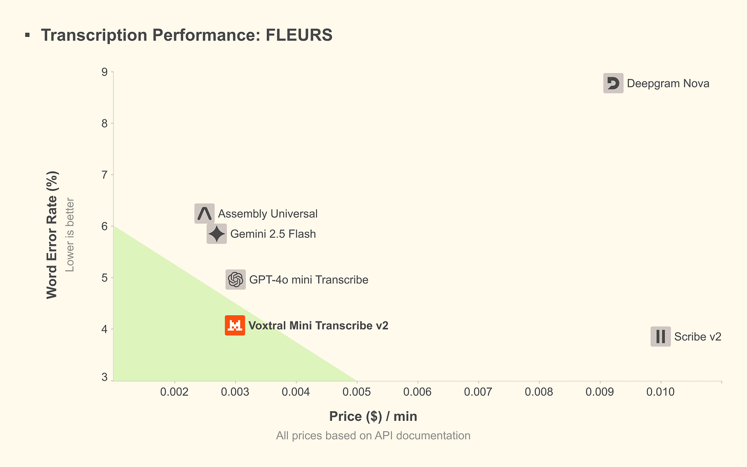 Voxtral Mini Transcribe V2 achieves the lowest word error rate at the lowest price point in the industry ($0.003/min).