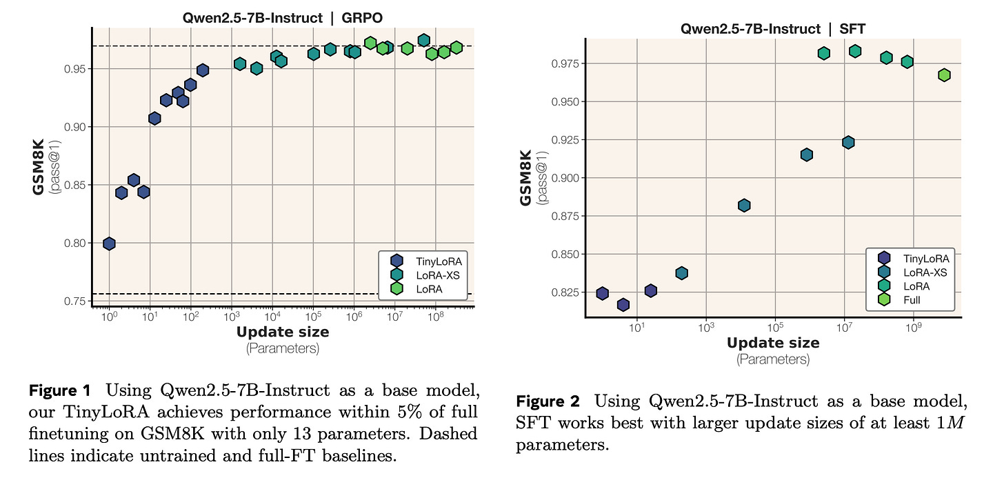 Note that such strong performance was achieved only with RL training. Models trained using SFT required 100-1000x more trainable parameters to achieve the same performance.