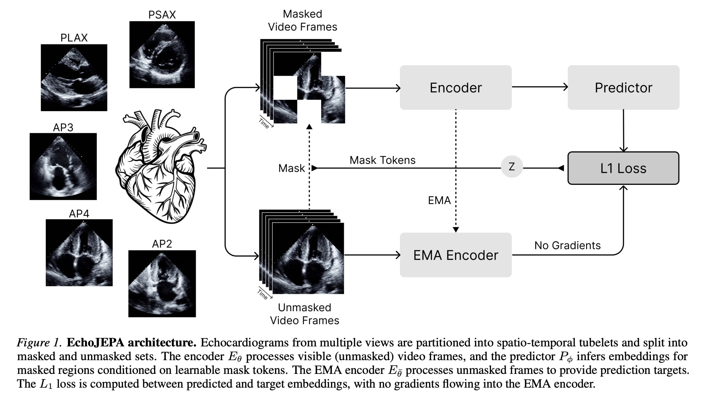The model uses a latent-prediction objective to learn strong anatomical representations that ignore speckle noise and artifacts inherent to ultrasound, thereby improving clinical metrics.