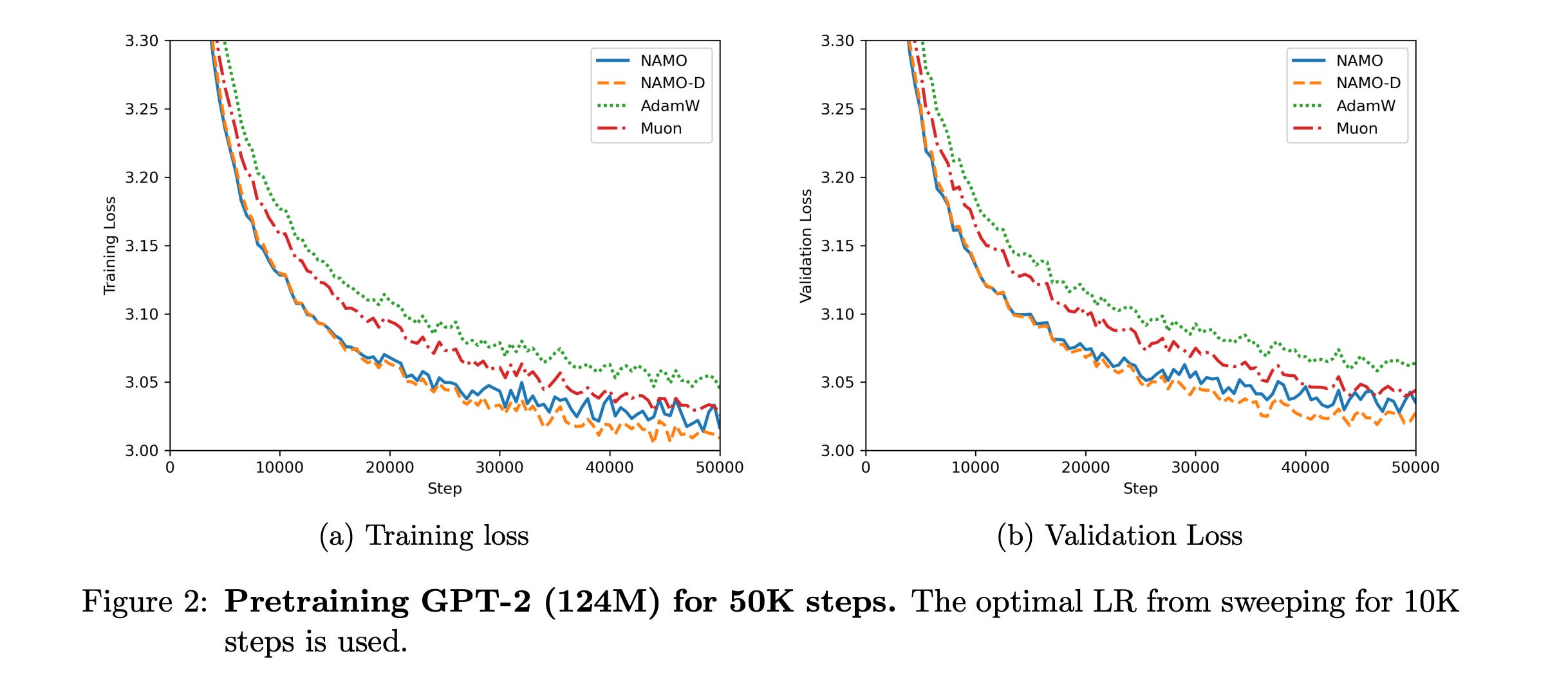 Empirical results from GPT-2 pretraining also show that NAMO, particularly NAMO-D, surpasses both AdamW and Muon baselines.