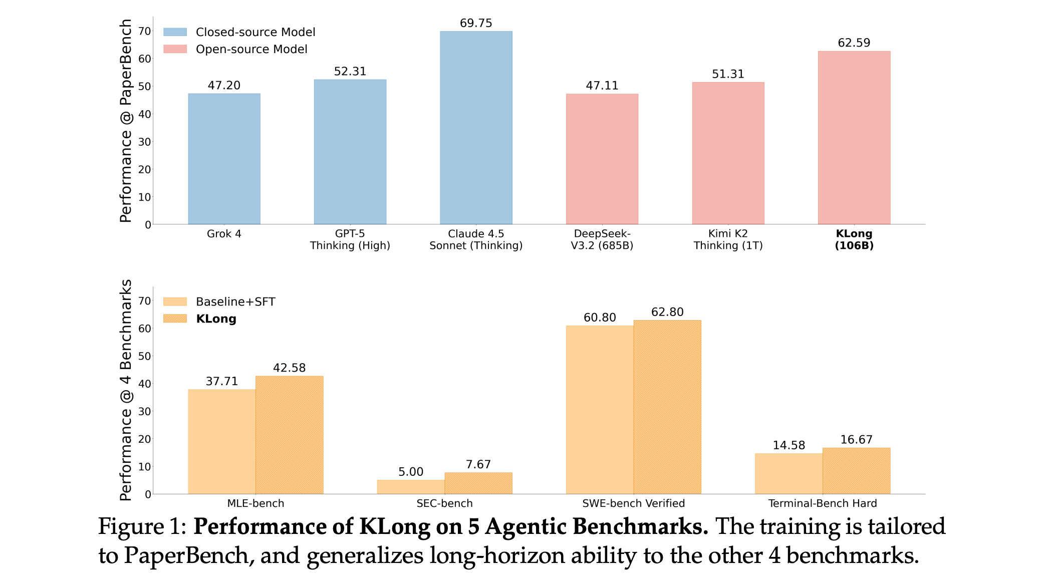 Experiments show that KLong greatly enhances performance on long-horizon benchmarks compared to baselines.