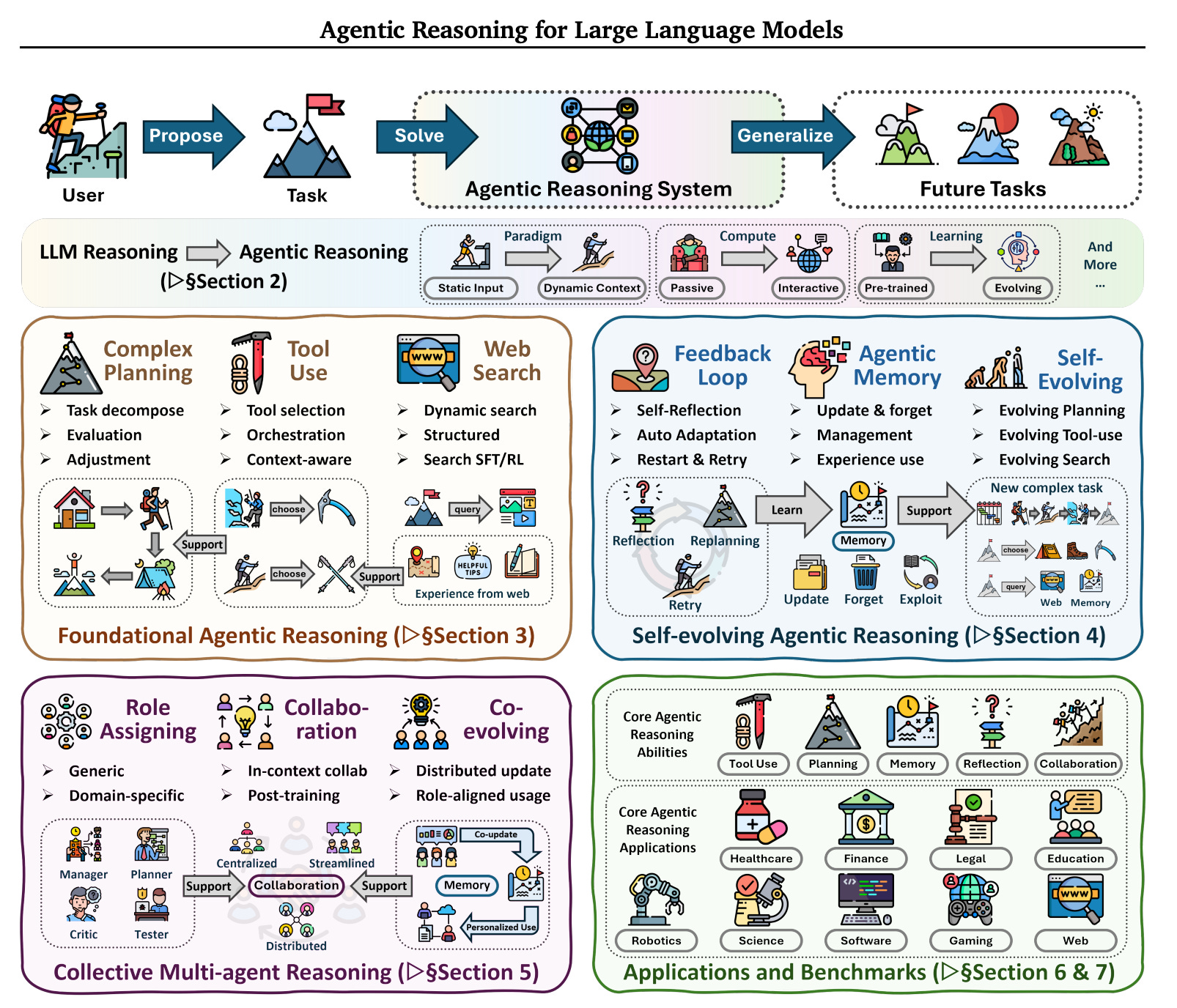 Self-evolving reasoning: This involves how agents improve themselves using feedback, memory, and adaptation in evolving settings.