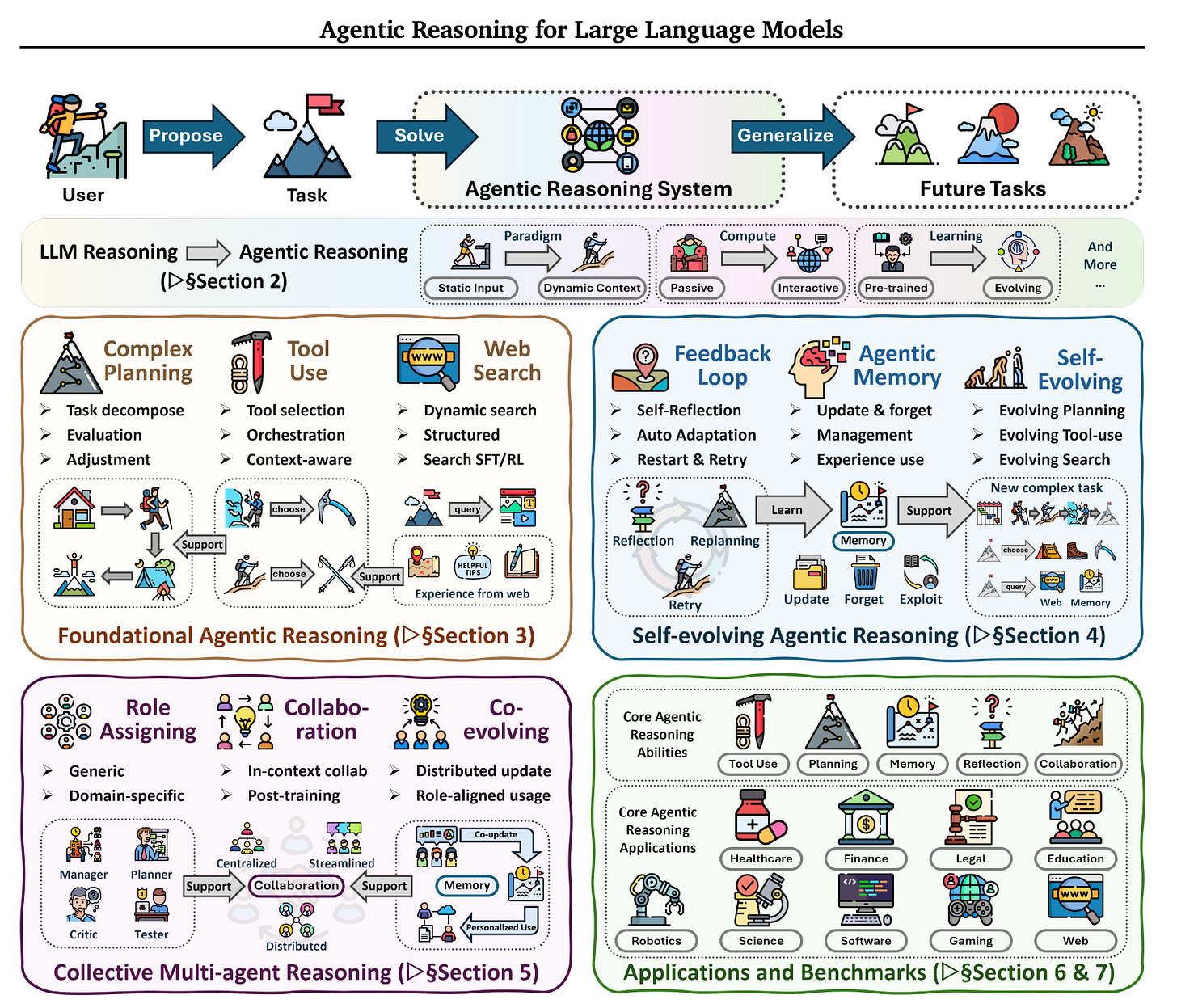 Foundational agentic reasoning: This involves single-agent skills such as planning, tool use, and search in stable environments.