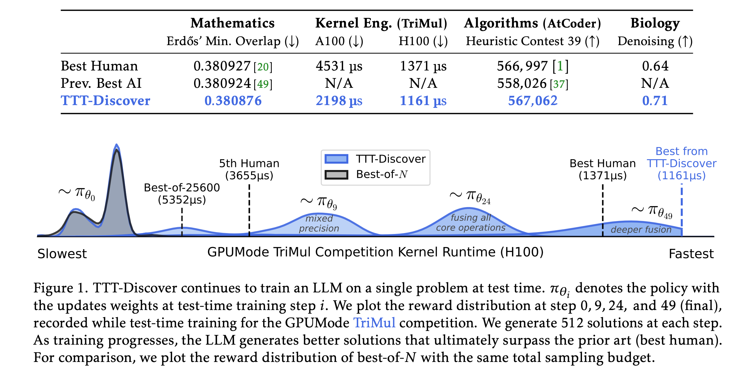 Experiments show that TTT-Discover achieves new SOTA results across a range of scientific and optimization challenges in mathematics, GPU kernel design, competitive programming, and biology, using an open model (OpenAI gpt-oss-120b) with practical compute budgets.