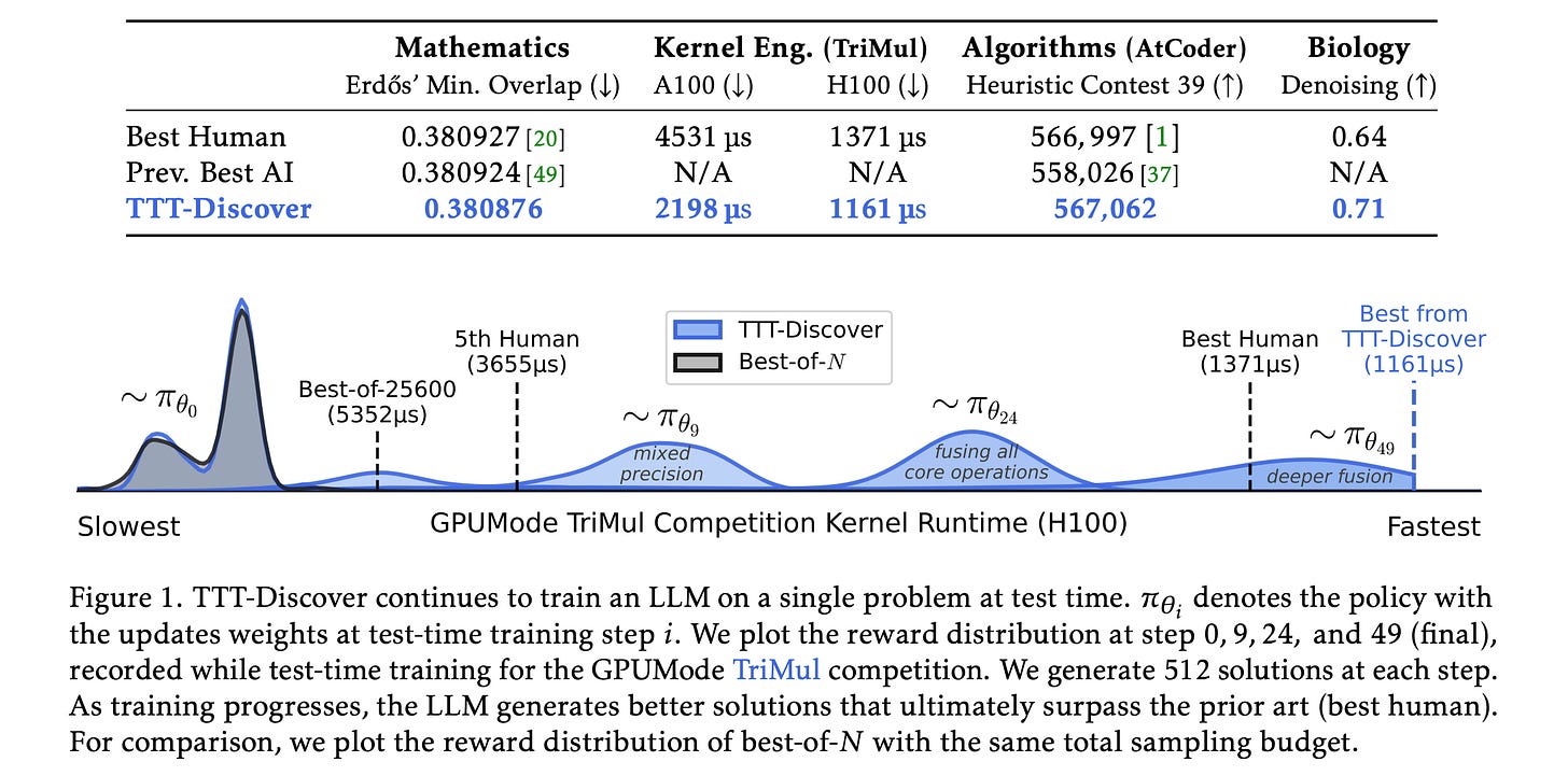 This research introduces a method calledย Test-Time Training to Discover (TTT-Discover),ย in which an LLM actively learns during test time to solve a specific problem exceptionally well, finding the single best solution for it rather than achieving average performance across many problems.