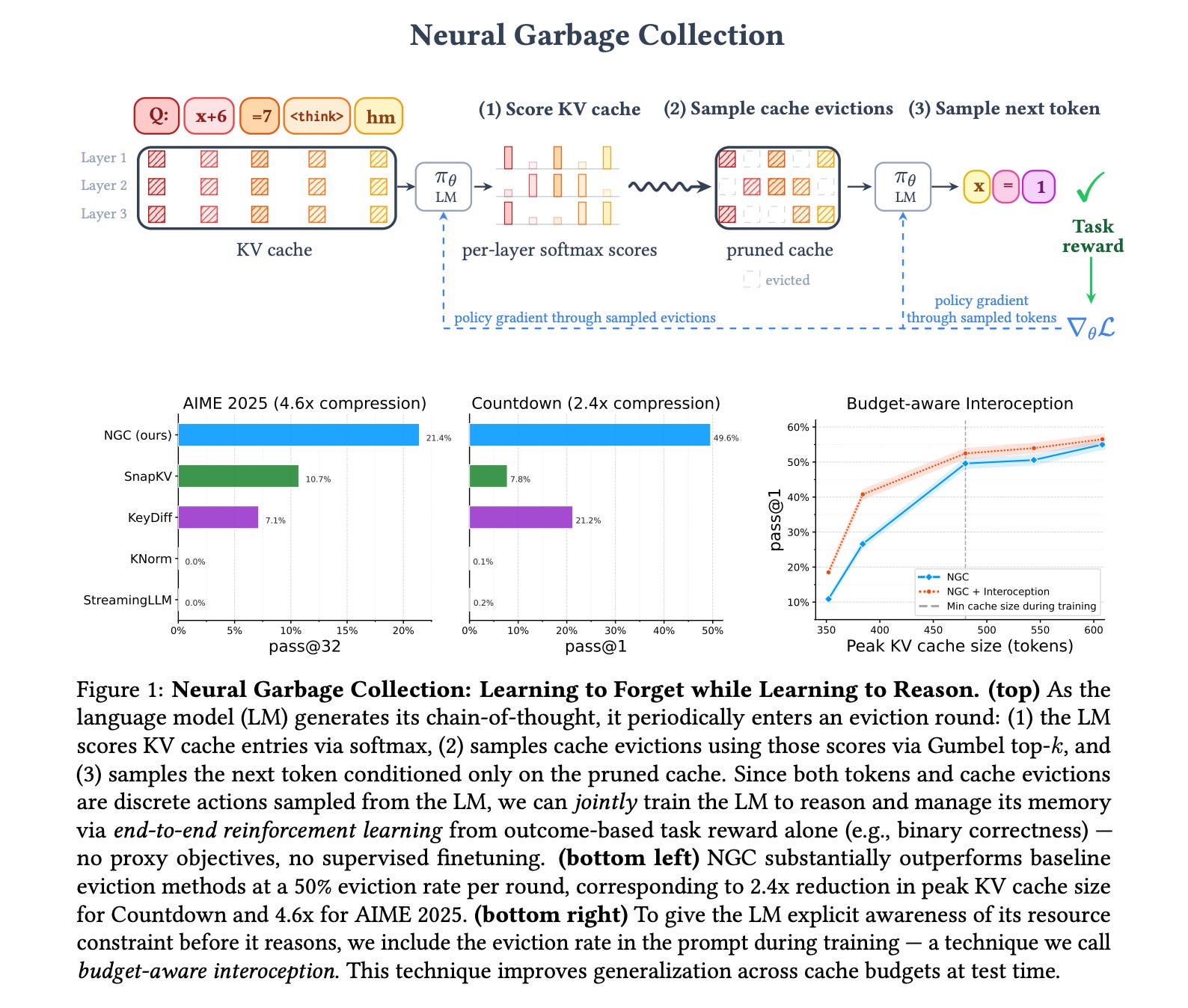 Instead of keeping all intermediate tokens (which creates large KV caches), a model is trained end-to-end with RL and an outcome-based task reward to learn which tokens to keep and which to discard to manage memory effectively.