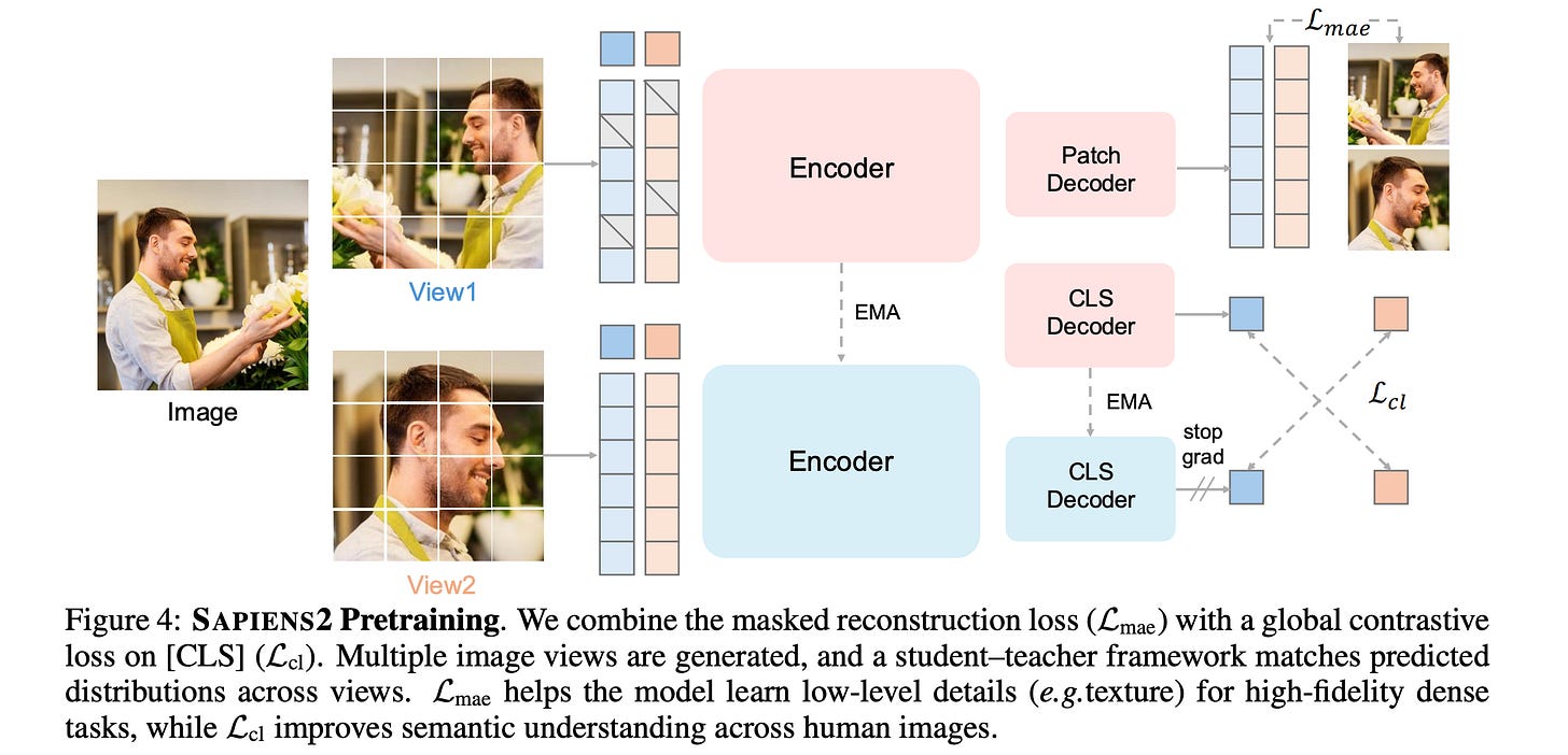 Sapiens2 models are pretrained using unified objectives (combining masked image reconstruction and self-distilled contrastive learning) on a curated dataset of 1 billion high-quality human images.