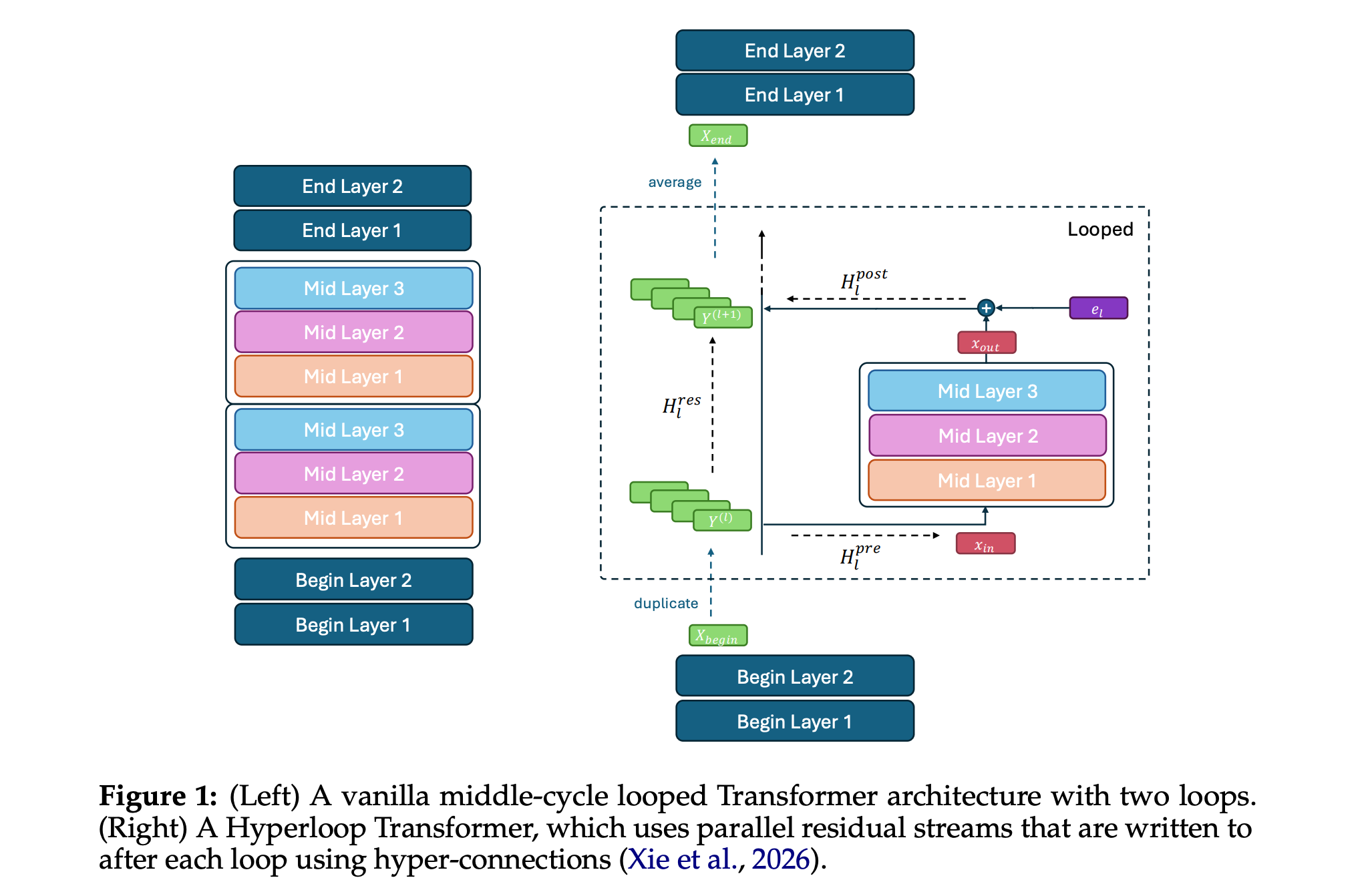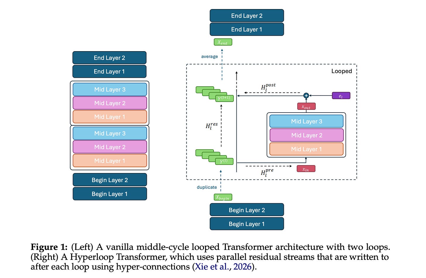 The looped Transformer is organized into three blocks (begin, middle, and end), where each block consists of multiple Transformer layers, and only the middle block is applied recurrently across depth. The looped middle block is further augmented by Manifold-Constrained Hyper-Connections (mHC), which are applied only after each loop to create the Hyperloop Transformer.