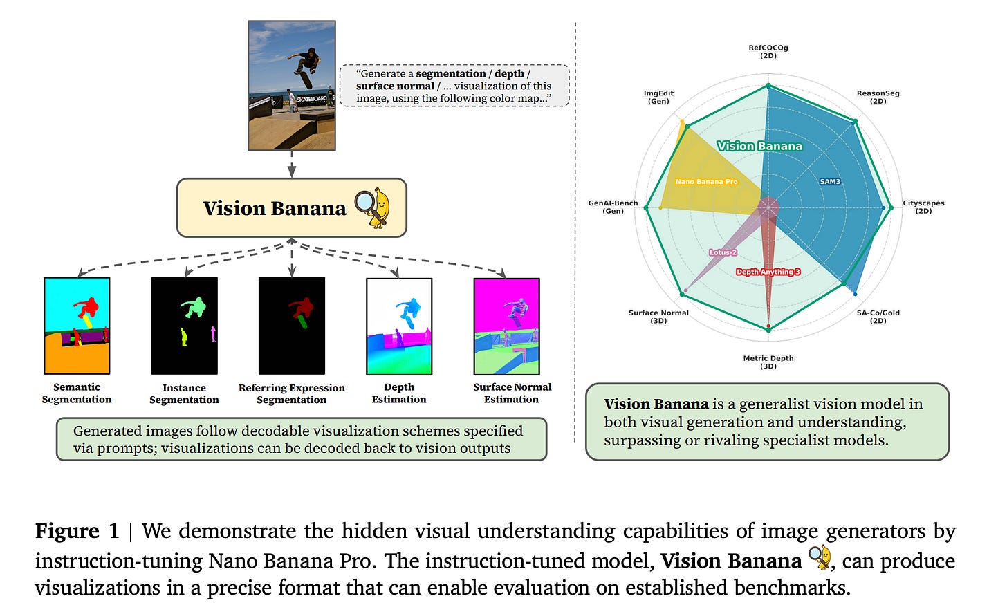 The authors show this with a generalist model called Vision Banana, built by instruction-tuning Nano Banana Pro (NBP) on a mixture of its original training data alongside a small amount of vision task data.