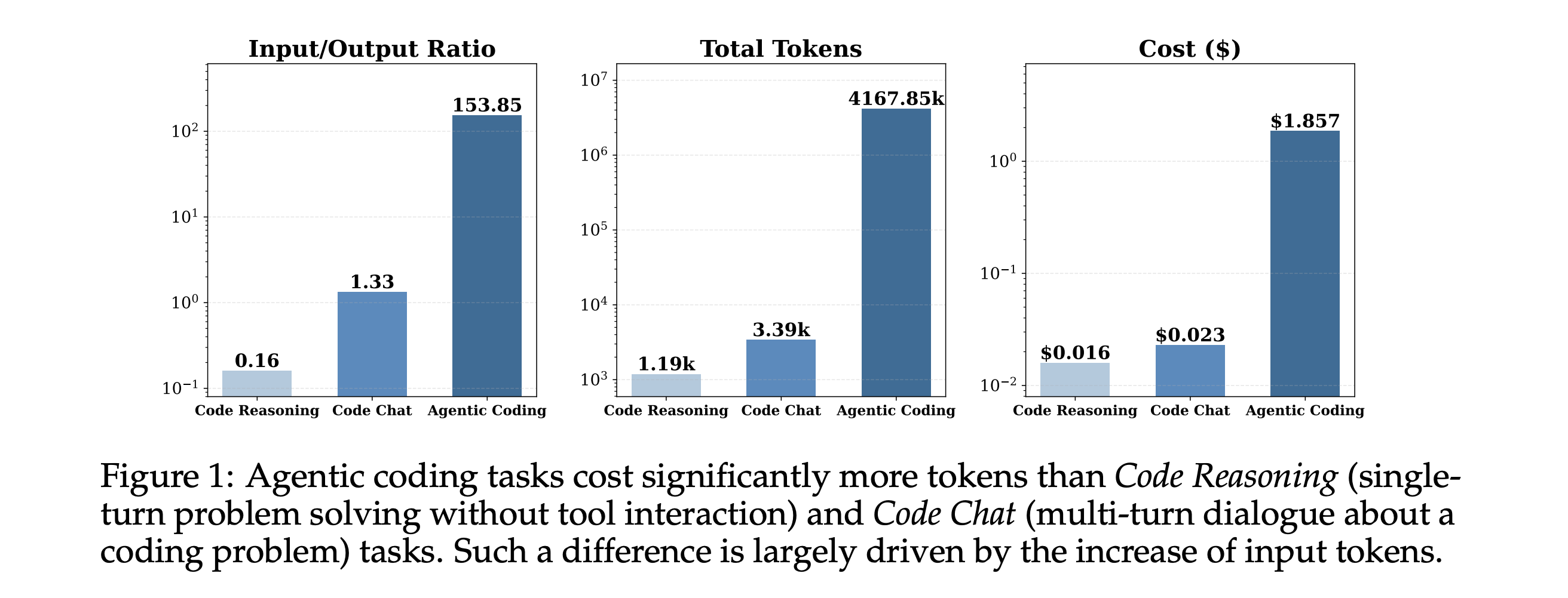 Agentic tasks consume 1000× more tokens than code reasoning and code chat, with input tokens rather than output tokens driving the overall cost.