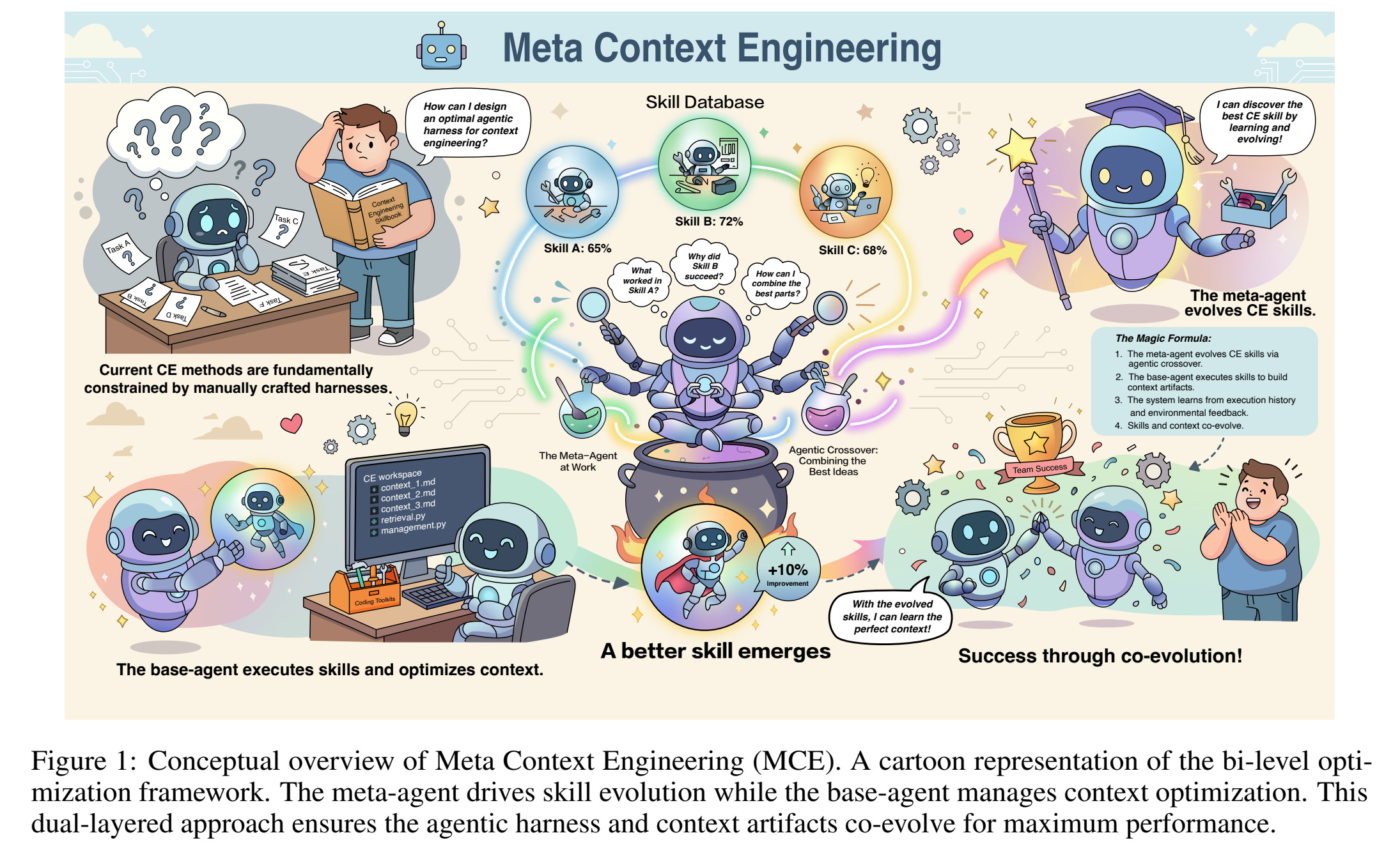 Instead of relying on rigid workflows or simple prompt templates, MCE learns to reorganize and adapt context dynamically across different fields.