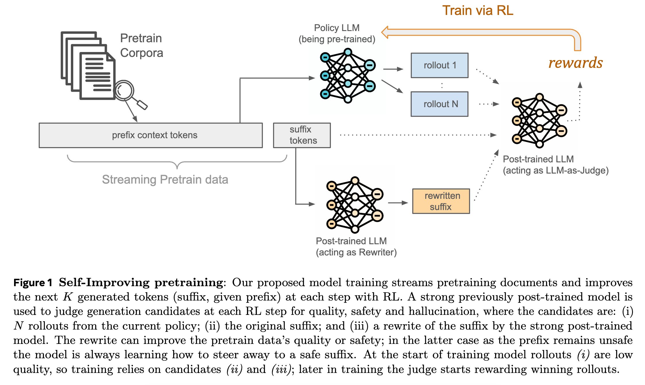 At each step, the model looks at several options, including model rollouts, the original suffix, and a rewritten suffix, and learns to favor the best choices.