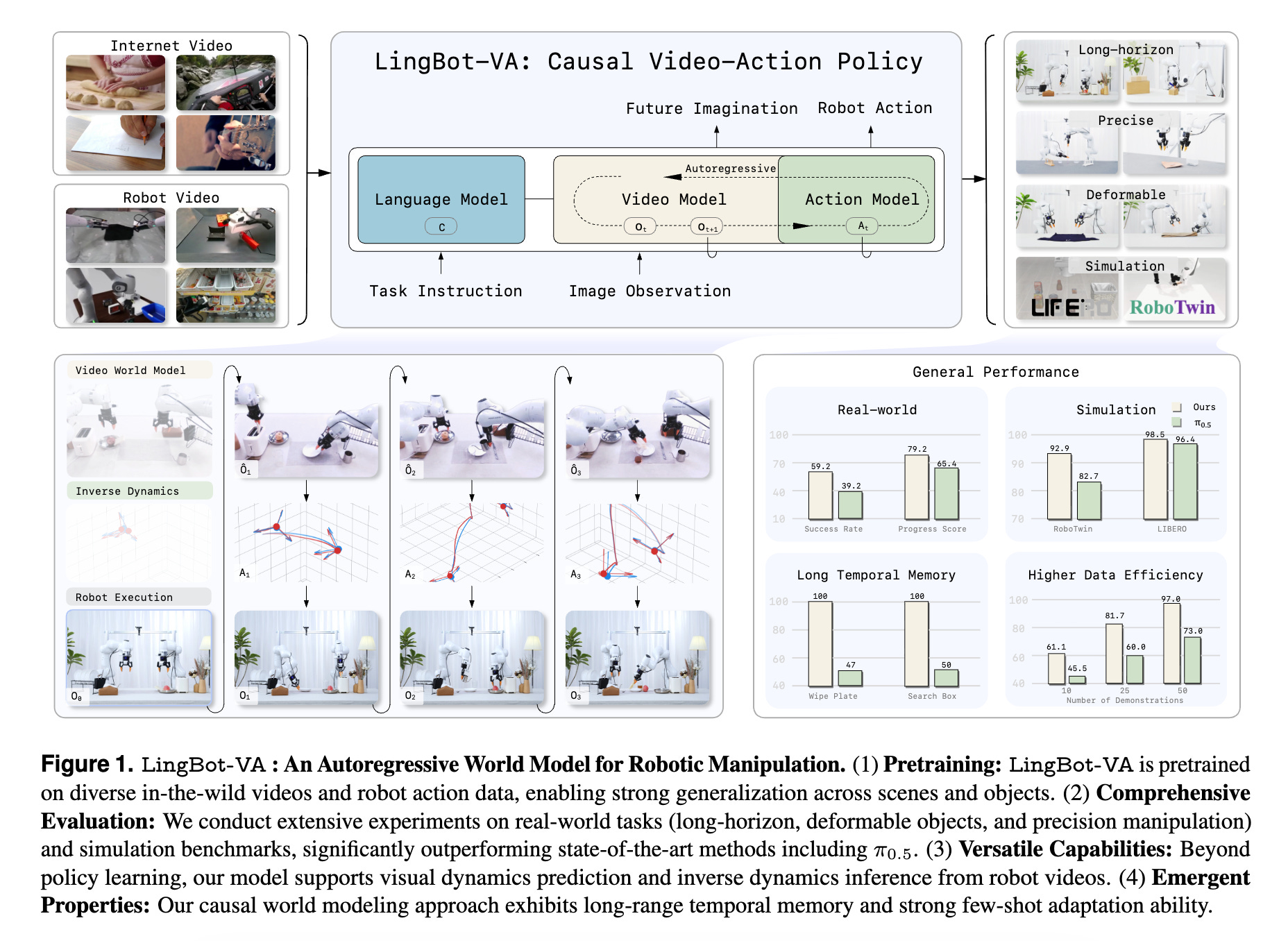 LingBot-VA operates in a closed feedback loop, allowing it to adjust actions continuously as new observations arrive, and uses an asynchronous inference pipeline that parallelizes action prediction and motor execution to support efficient control.