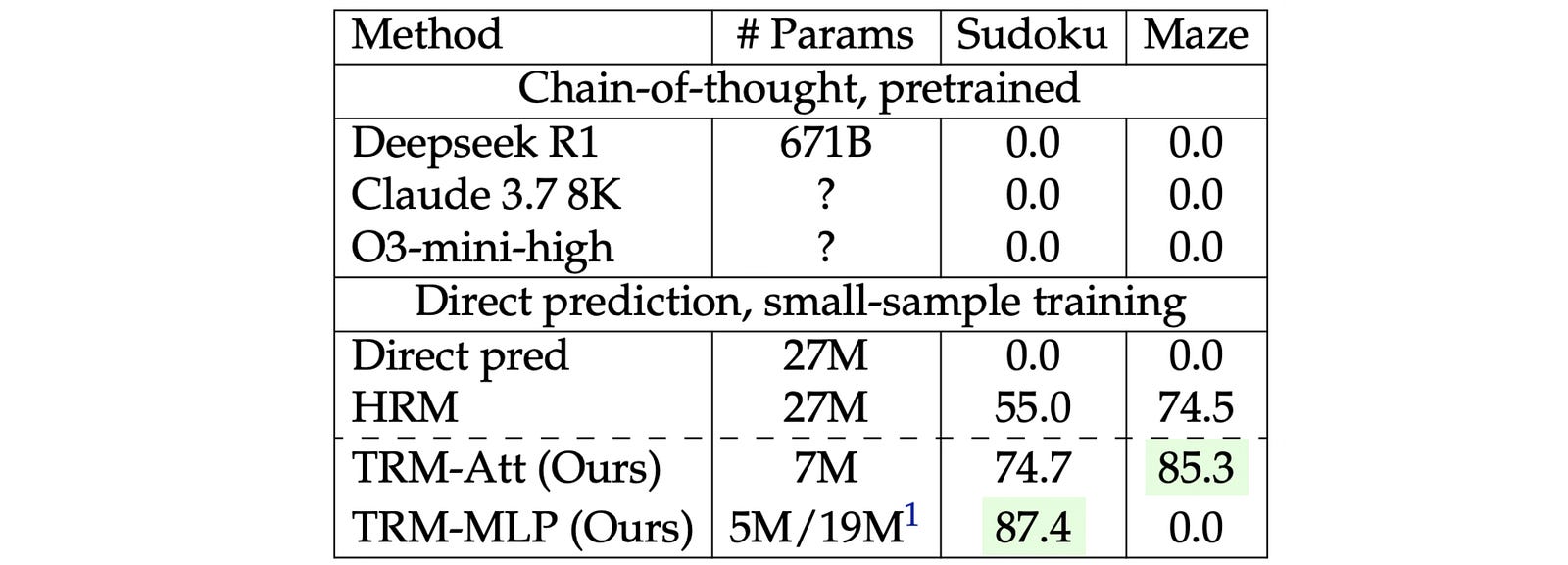 It’s surprising how TRMs, while being so small, can get such high accuracies on these tough benchmarks, while reasoning LLMs with billions of parameters fail badly on them.
