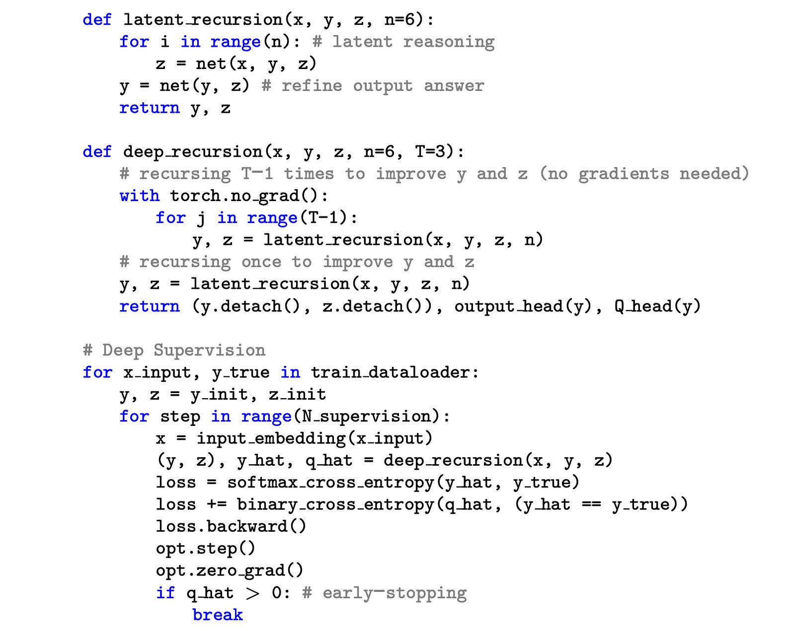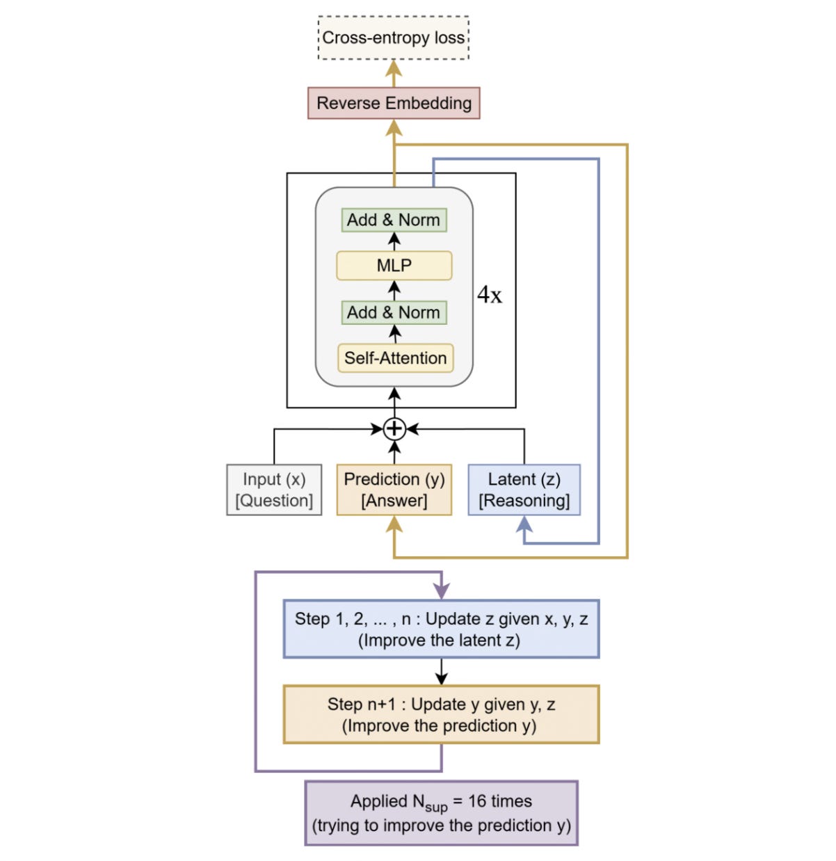 x: The input embedding (similar toxin an HRM)y: The current predicted answer (similar toz(H)in an HRM)z: A latent representation that the model uses to reason when arriving at its prediction (similar toz(L)in an HRM)